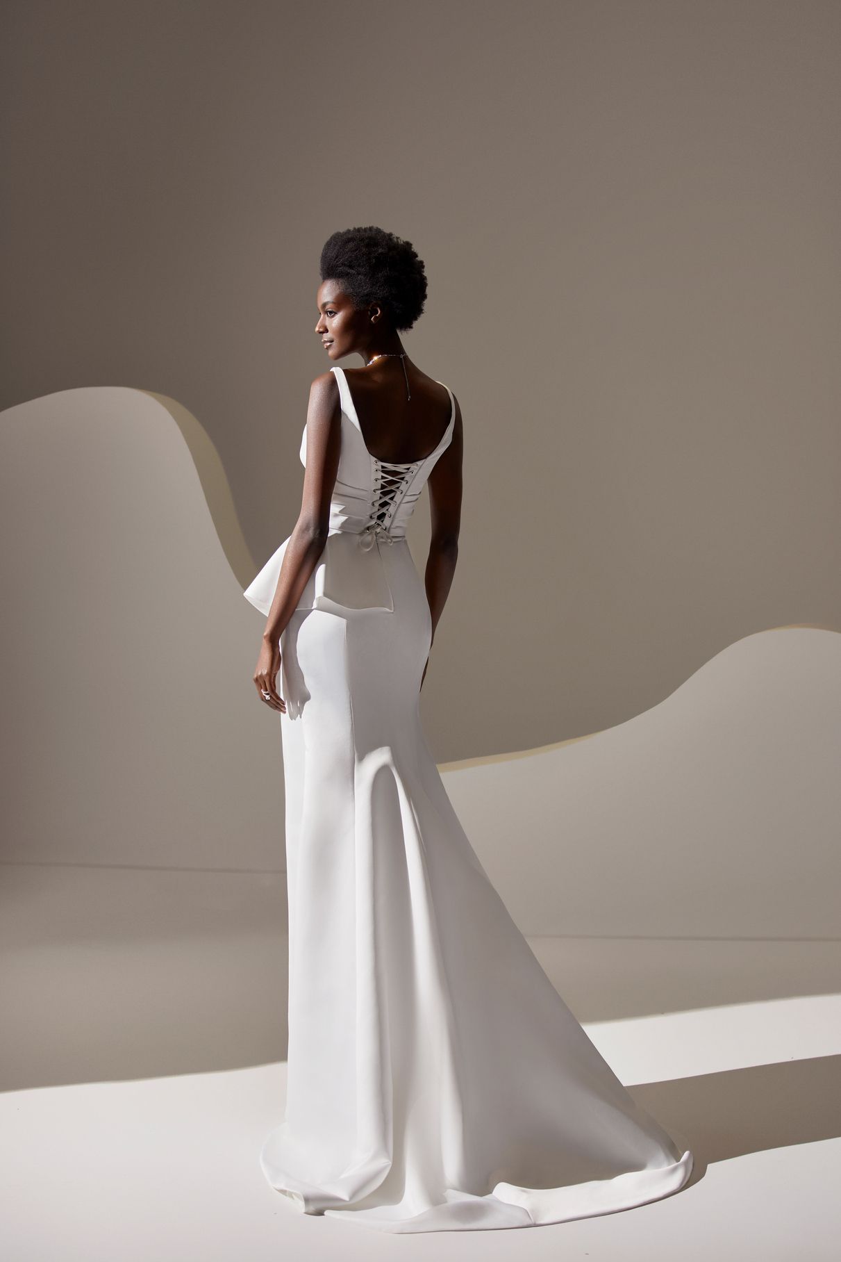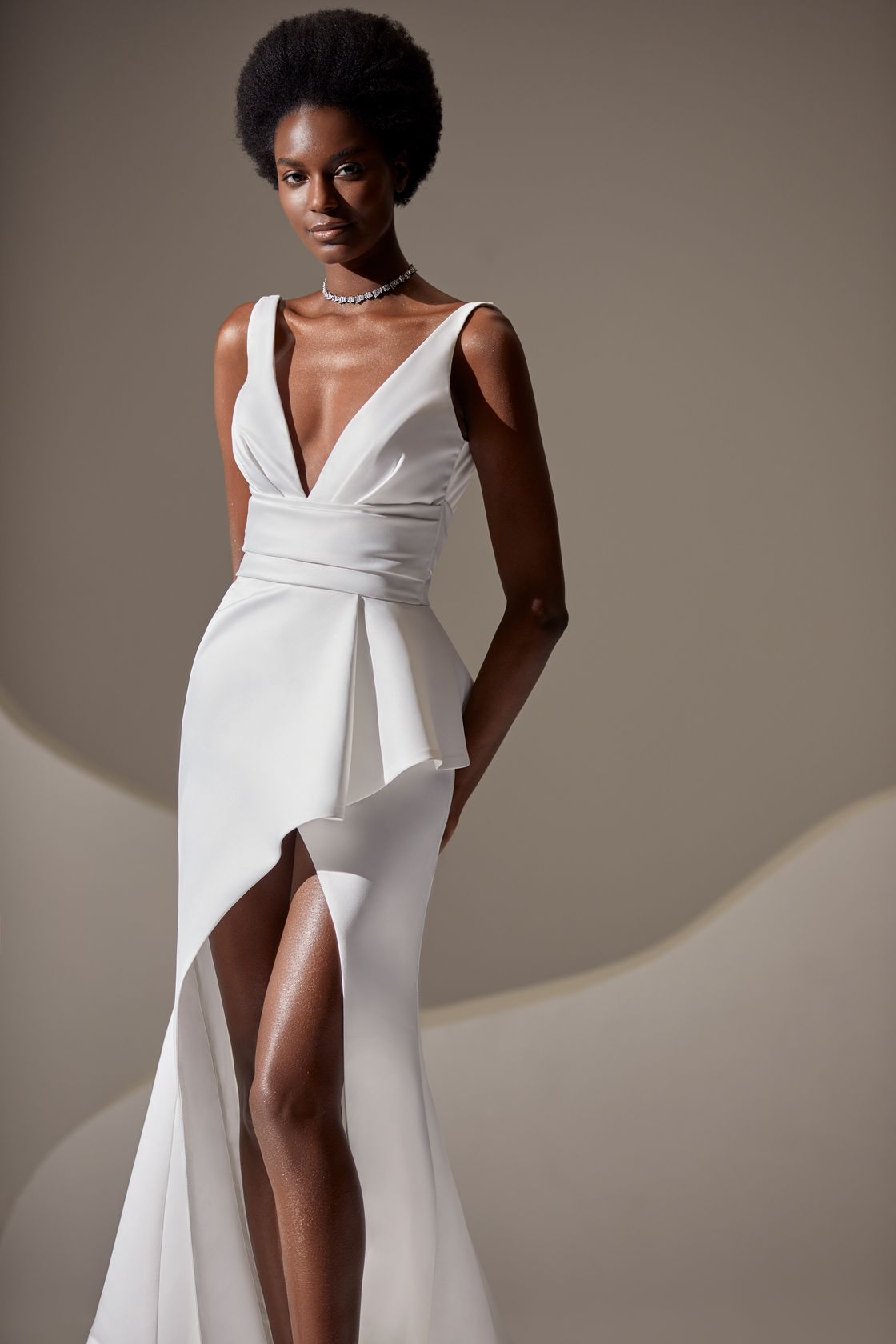Mermaid wedding gown in satin with a ruched skirt and a slit.