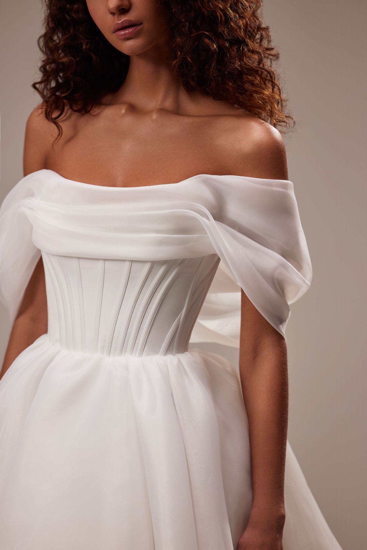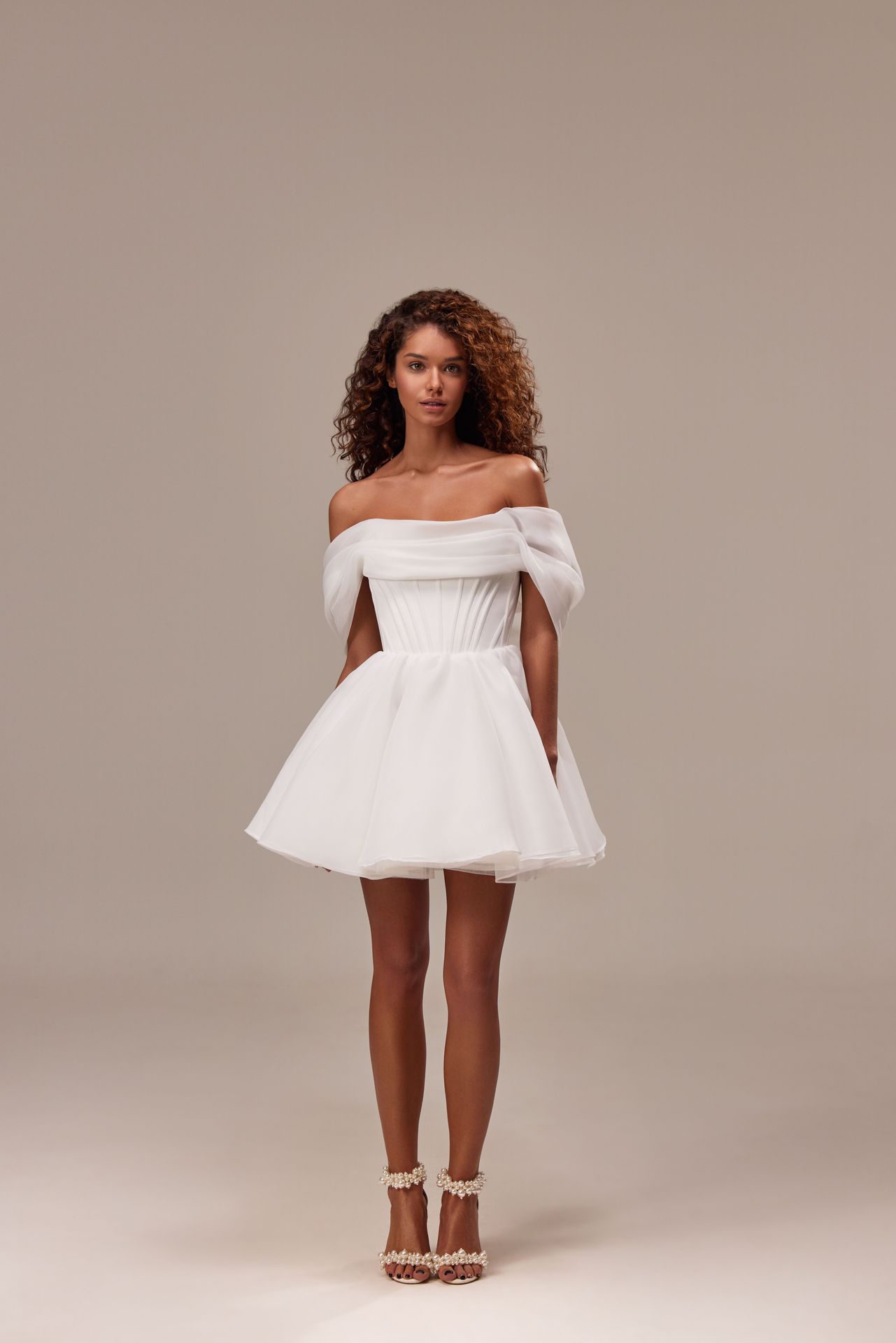 Spectacular off-the-shoulder mini dress cut from flowy organza. Featuring a boned heart-shaped corset with a lace-up closure on the back, and a cute flaring mini skirt. This style will be perfect as a second wedding dress or evening party dress.