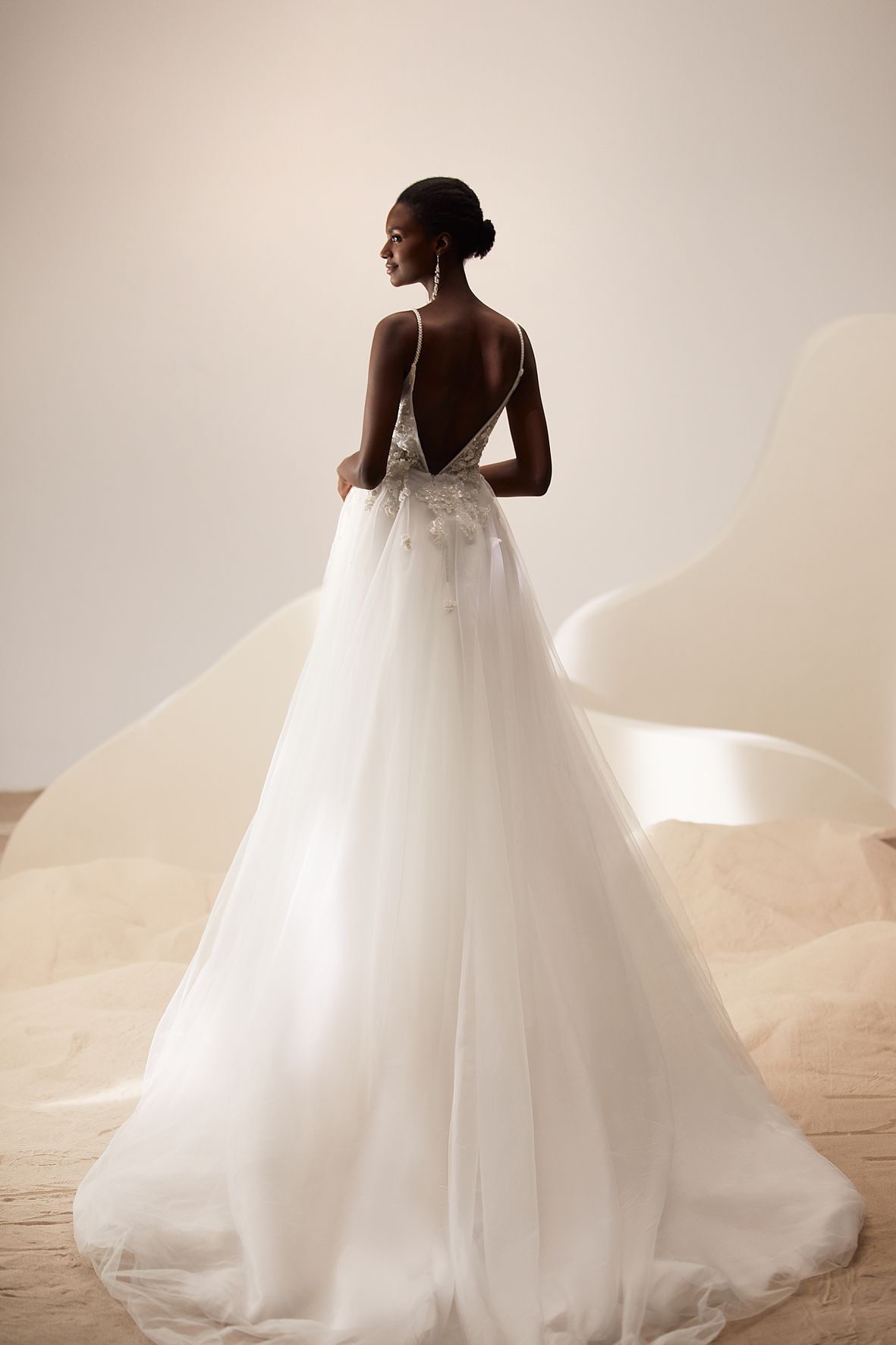 A-line straped tulle wedding dress with V-neckline adorned with the draping, lace appliques and 3D flovers.