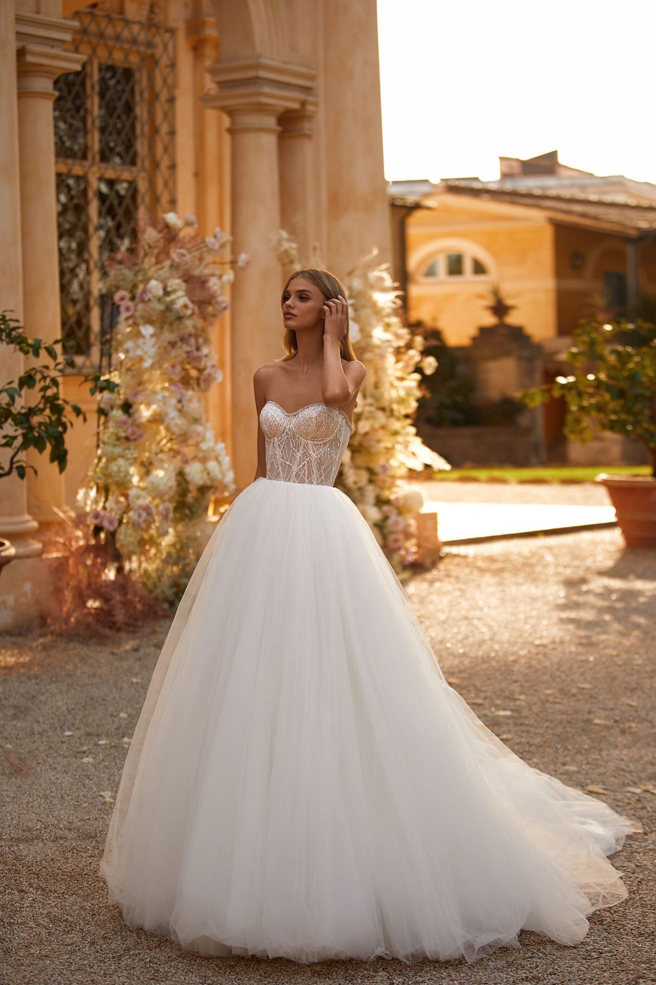 Tender combination ball gown with a heart-shaped sequined bodice, fluffy tulle maxi skirt, and a lace-up closure or a zipper on the back. Can be styled with a tulle skirt or a sparkly glitter skirt.