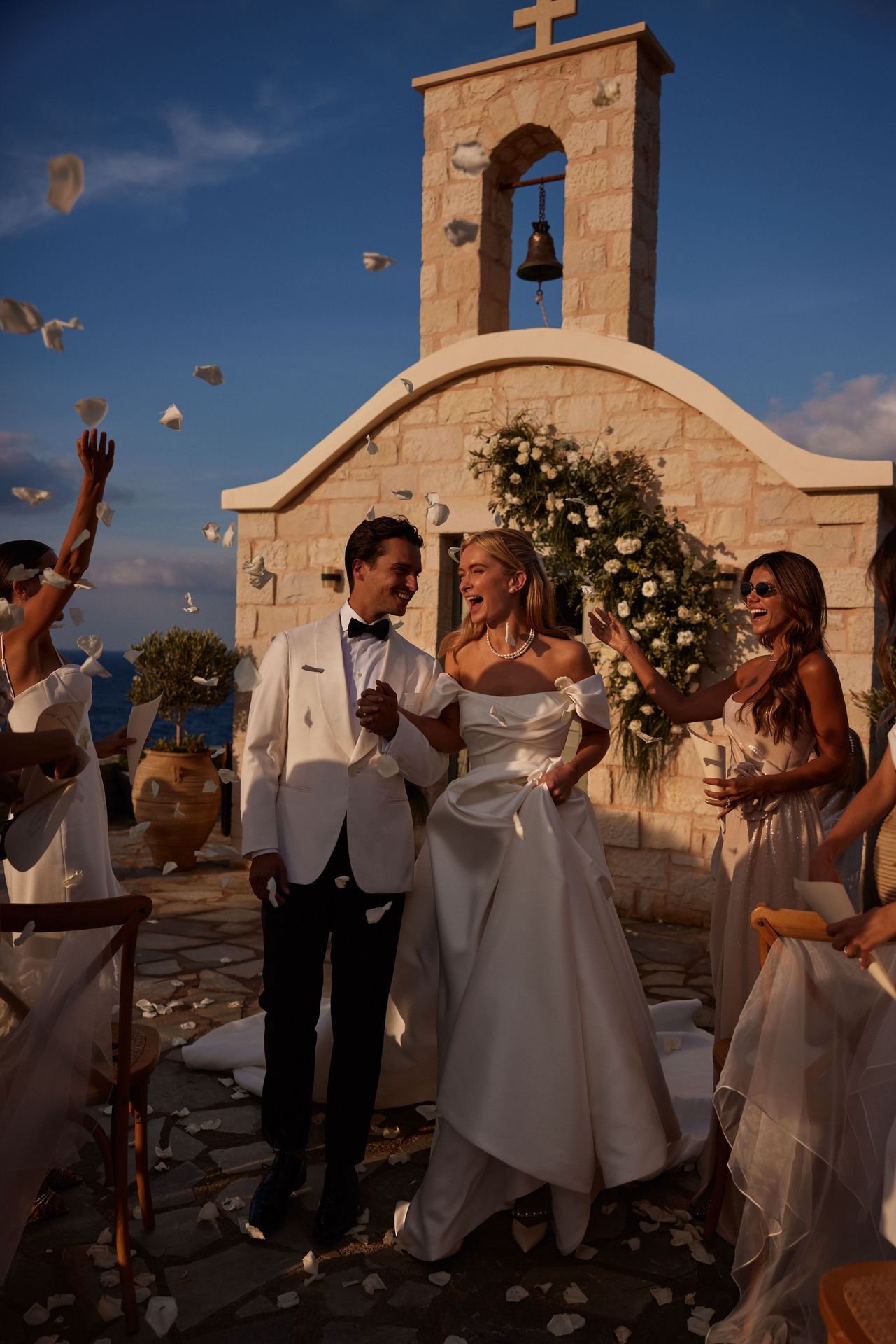 Posh princess wedding gown crafted from luxurious mikado. The design features a corset-style bodice with detachable, delicately draped off-the-shoulder sleeves, a cinched waist, a zip or lace-up closure on the back, and an asymmetrically draped skirt. The gown culminates in a draped full maxi skirt with a sweeping maxi train. Pair with a Valora cathedral-length tulle veil for an added hint of sophistication.