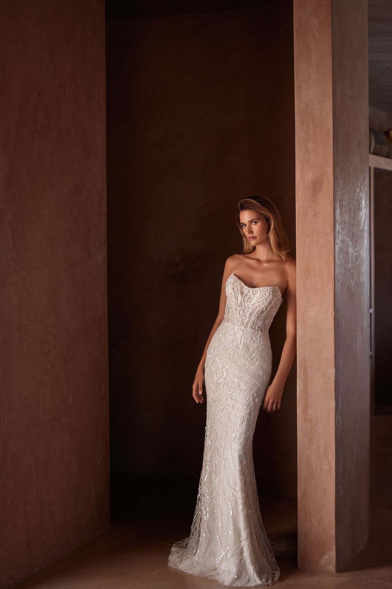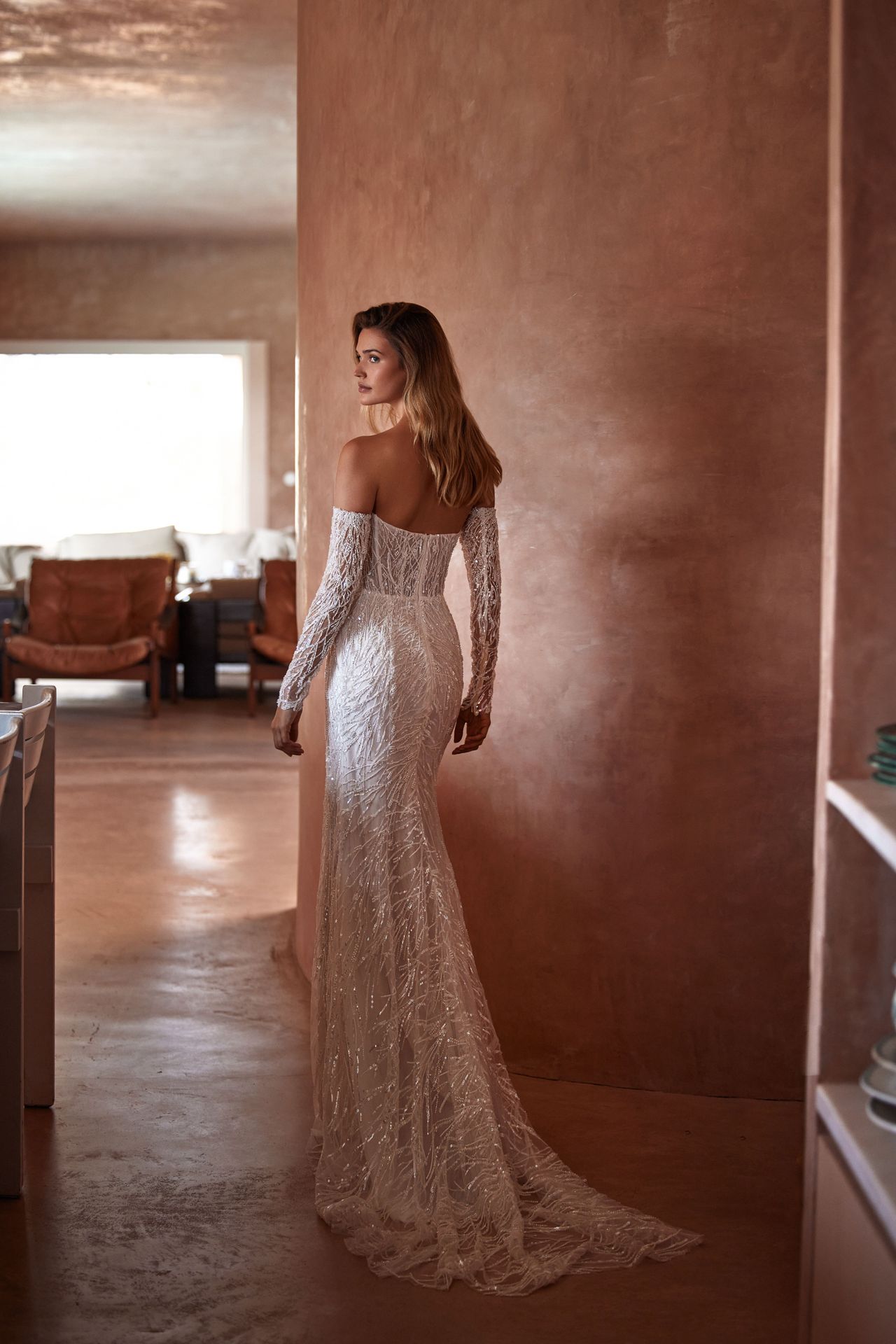 Extraordinary mermaid gown fully covered in sequinned pattern. Featuring a semi-straight semi-heart-shaped neckline, zip closure on the back, and a fitted skirt with a midi train. Can be complimented with a detachable puffy tulle skirt adorned with volumetric flowers and off-the-shoulder shiny long sleeves.