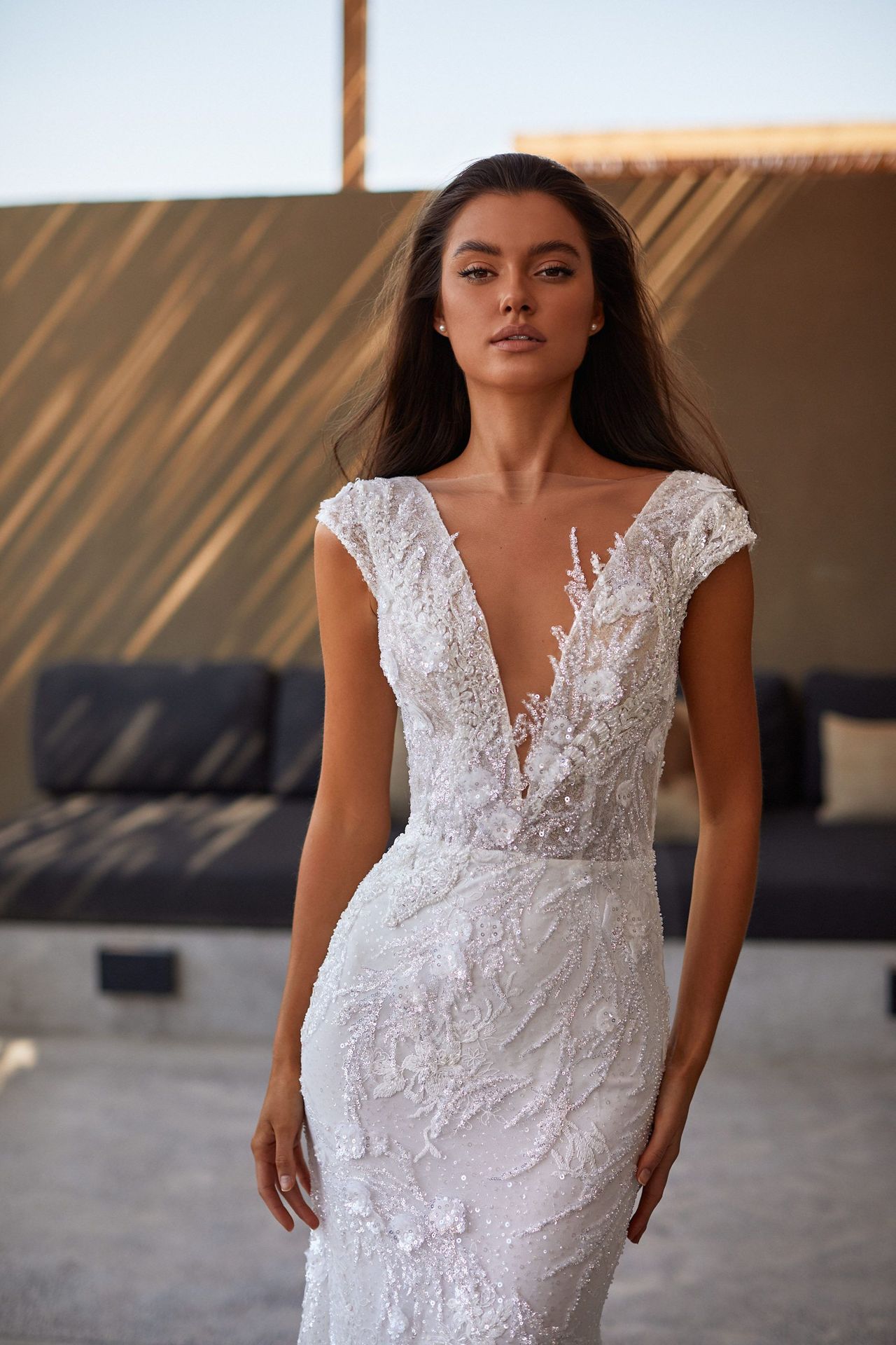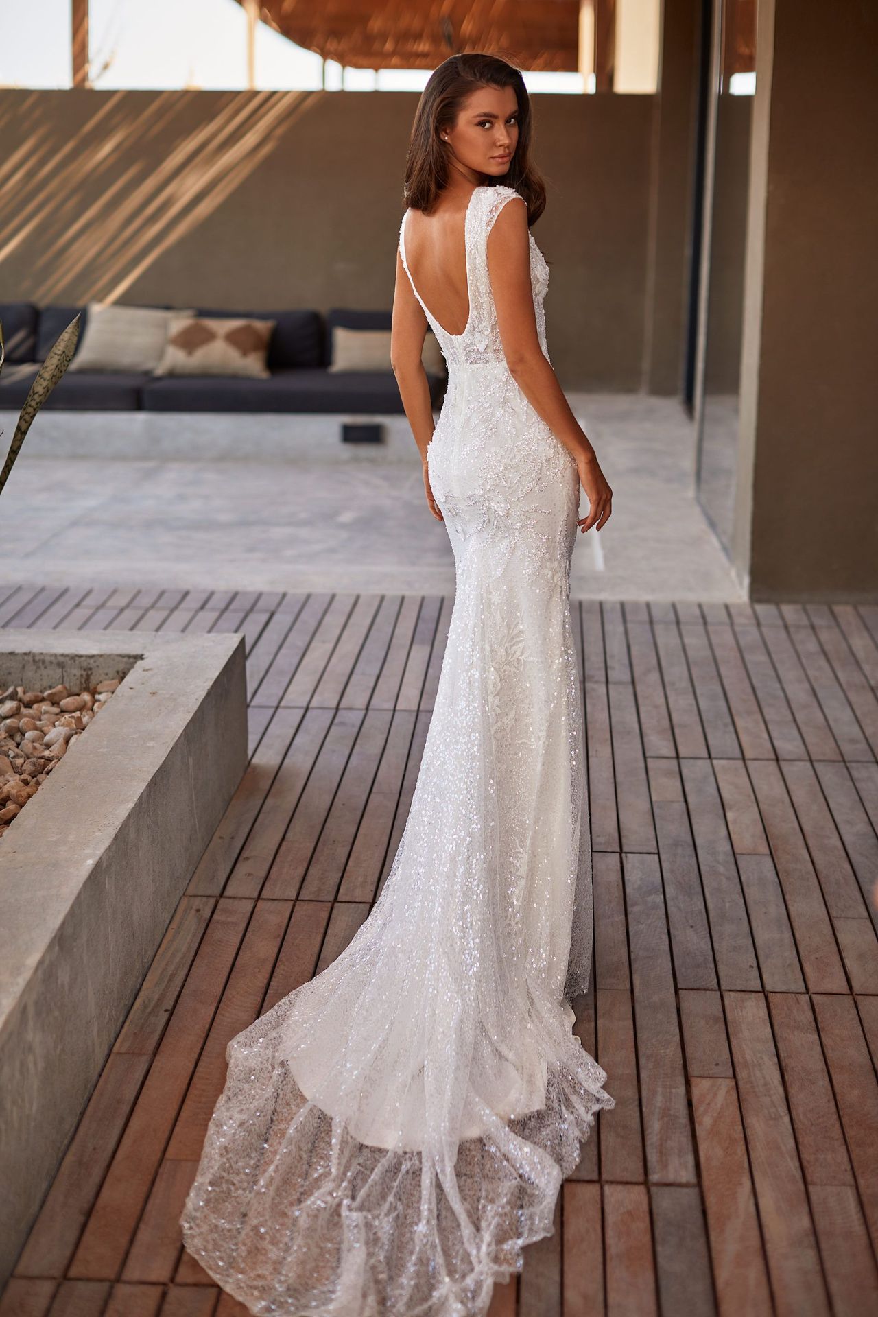 Delicate sheath wedding dress in white color with a sparkling beaded tulle fabric, plunging V-neck, open back and a long sheer train.