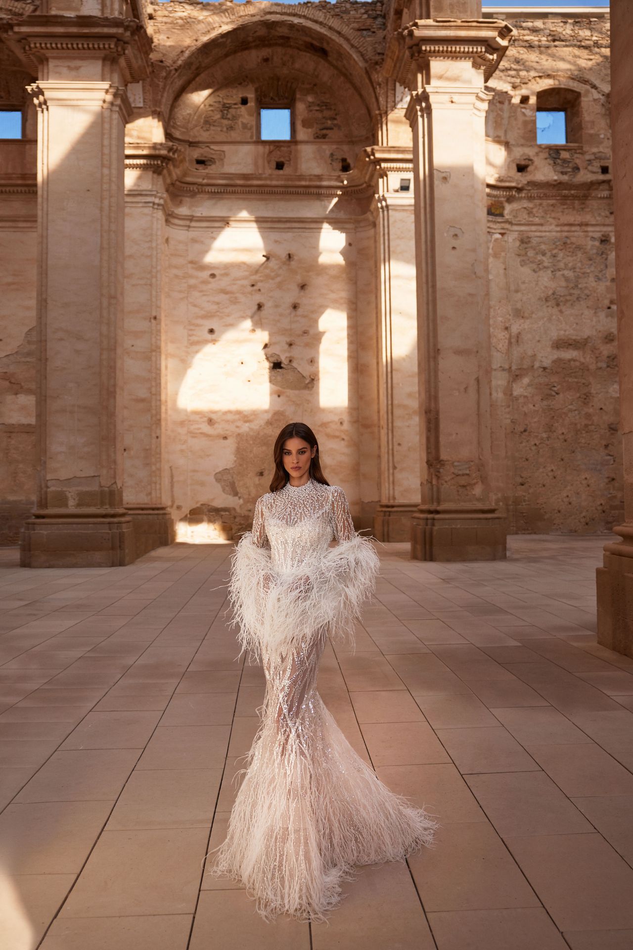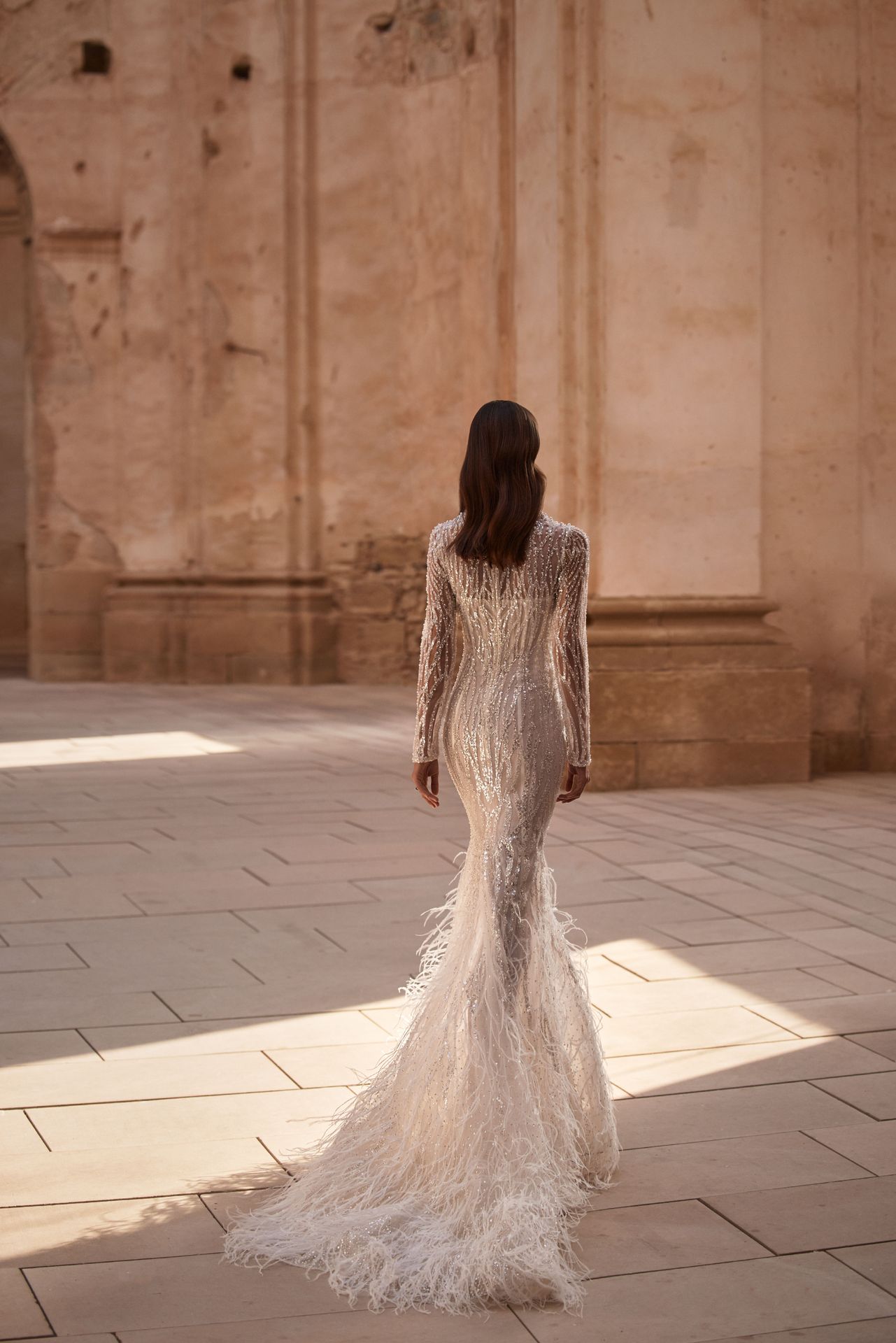 Striking semi-transparent long-sleeved wedding gown dramatically adorned with pearls and sequins by hand. Featuring a sculpting mermaid silhouette with a delicate turtleneck, zip-closure sheer back, and a voguish feather embellished skirt with a delicate train. Comes with a second-skin shaping underwear dress, and a detachable underskirt Nivea. The look can be elevated with a bizarre handcrafted feather bolero.