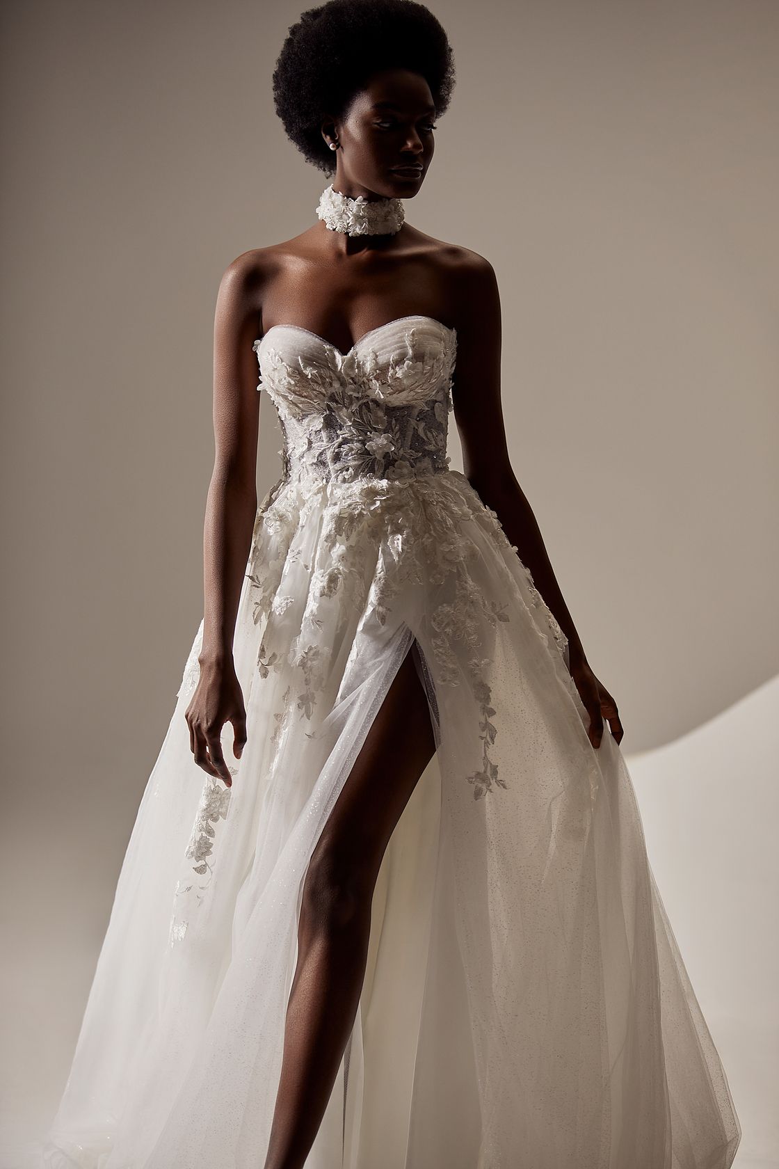 A-line tulle dress with sweetheart corset adorned with 3D flowers and skirt with long train and a slit. Can be complemented with detachable bolero with bishop sleeves or a choker.