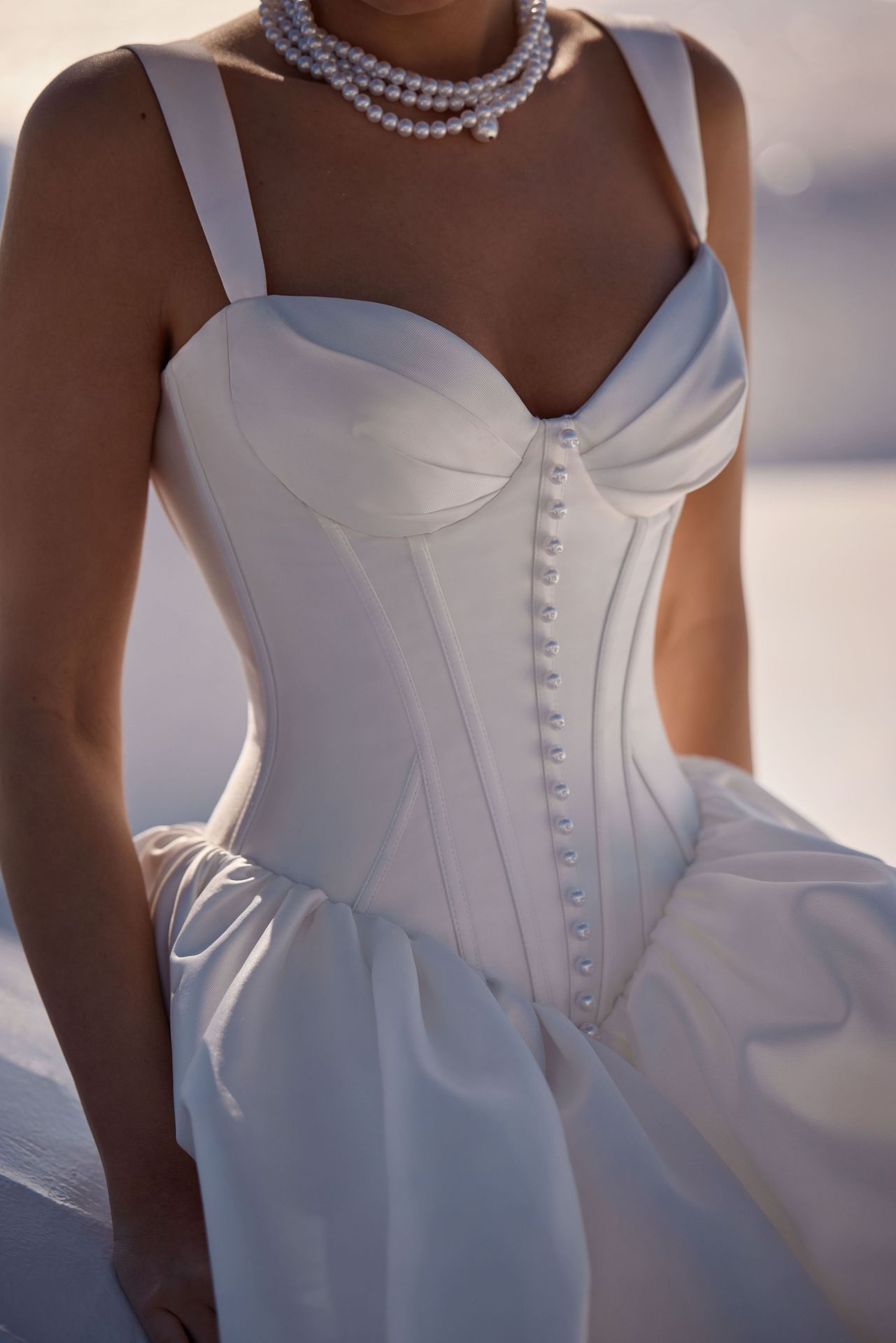 Enchanting wedding ballgown fashioned from lustrous mikado. Featuring a heart-shaped decolletage with shell-like cups, a drop-waist corset bodice with visible boning, and a voluminous skirt with an opulent train. The corset can be decorated with buttons or pearls on the front.