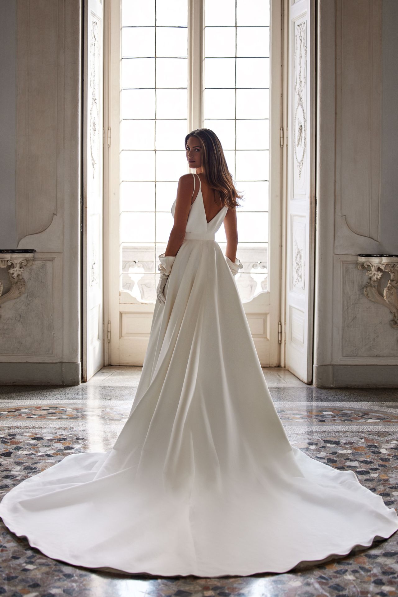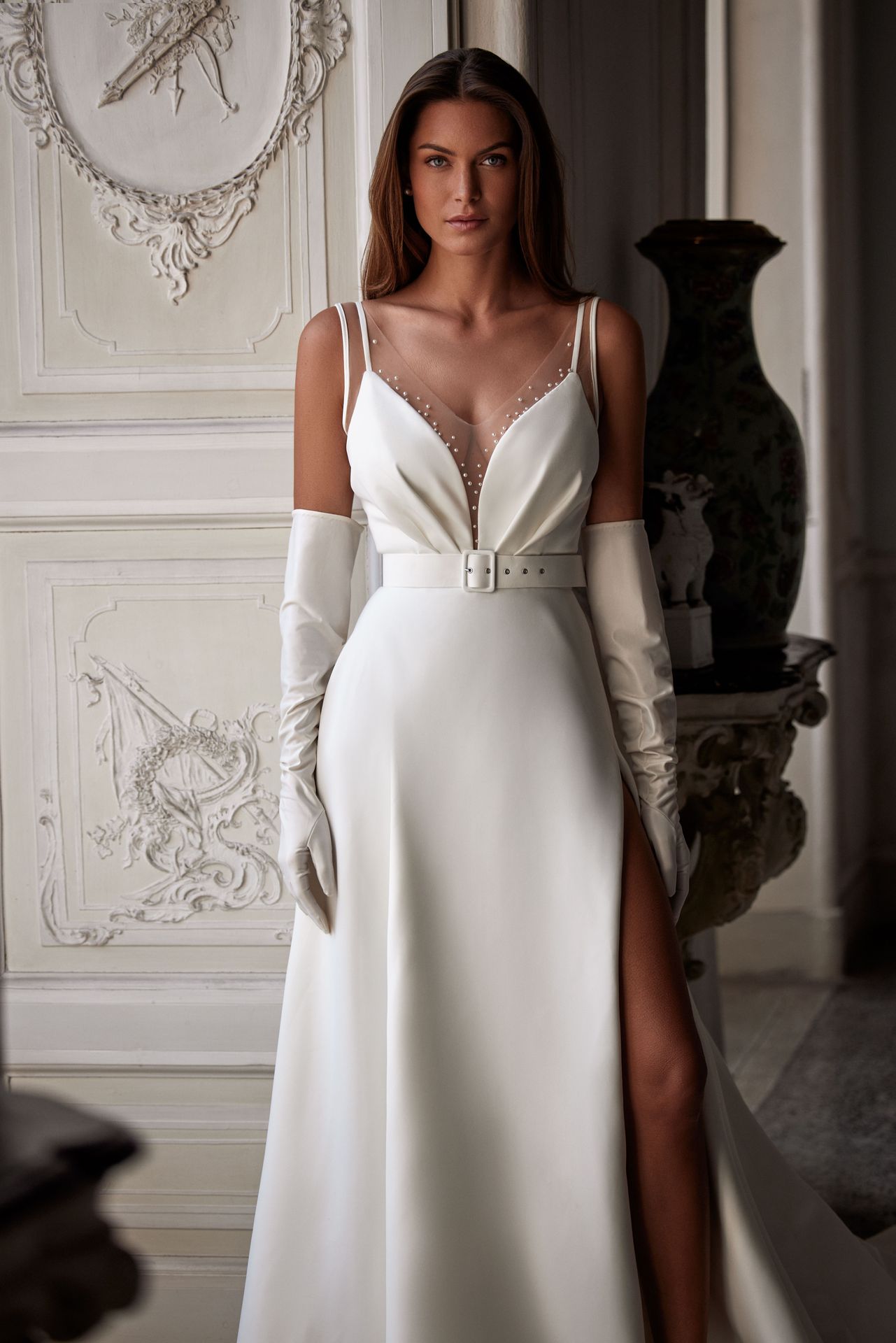 Sophisticated and minimalistic A-line wedding gown in mikado. Featuring a delicate illusion plunging neckline sprinkled with crystals, double spaghetti straps, an alluring open back, a sequinned waist belt, and a full skirt with a high side slit.
