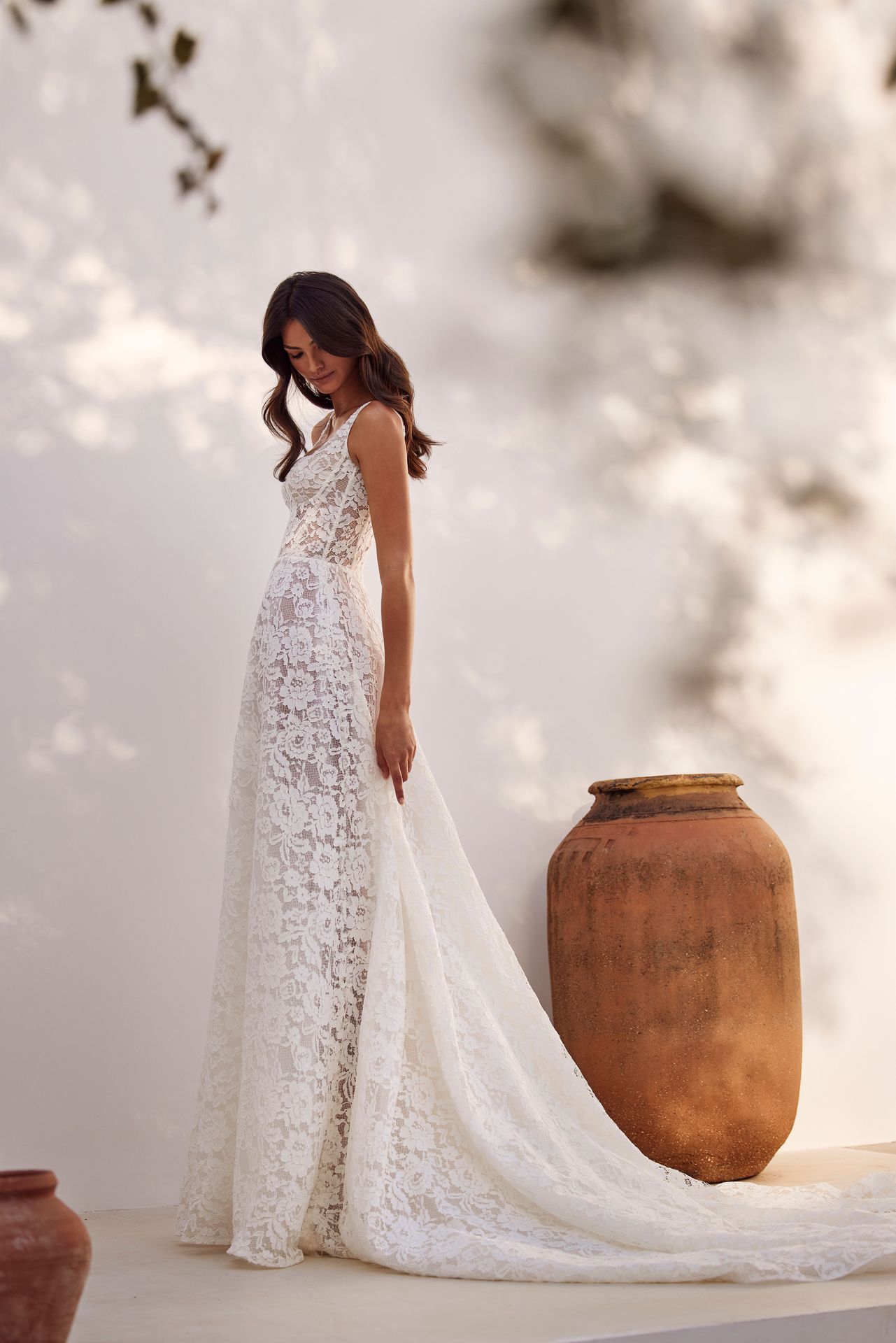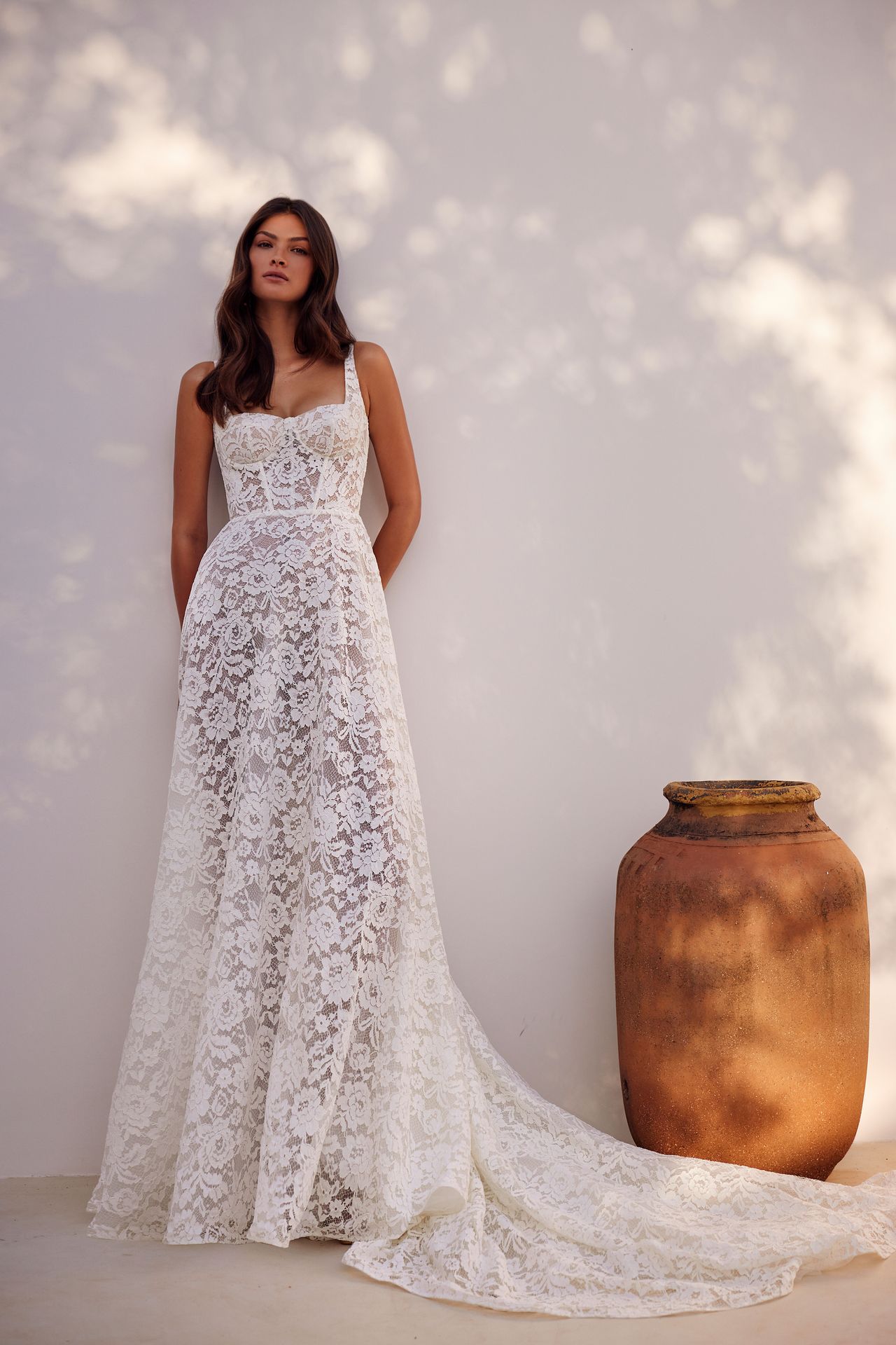 Striking fully covered in floral lace strapped A-line gown. Featuring a heart-shaped neckline with built-in cups, semi-transparent lining, and a maxi skirt with a long train. The lace-up closure on the back can be changed to a zipline by request.