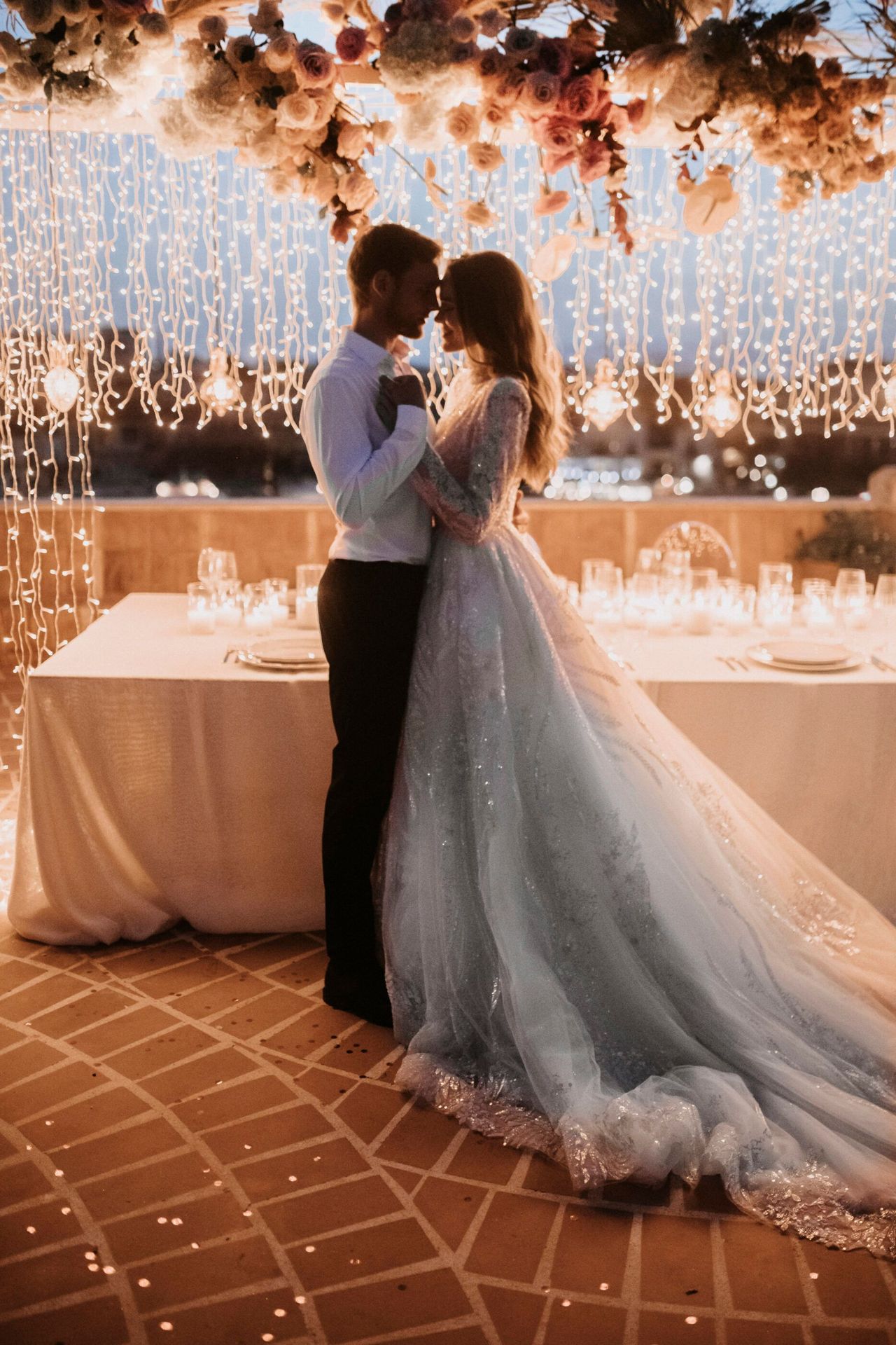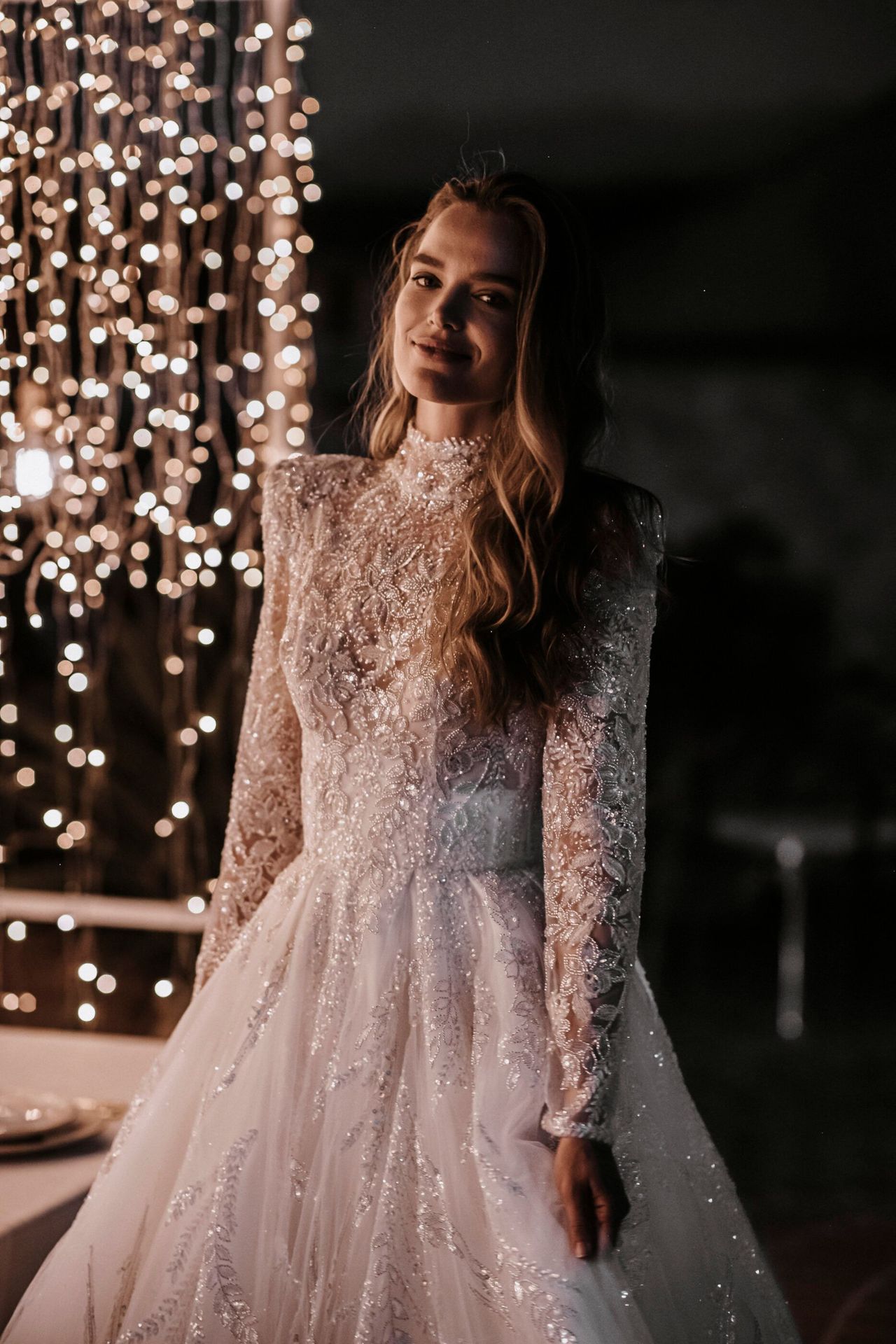 Sparkly, fully adorned wedding ball gown. Features a turtleneck bodice, semi-transparent crystal beaded long sleeves, and a full skirt with a train.