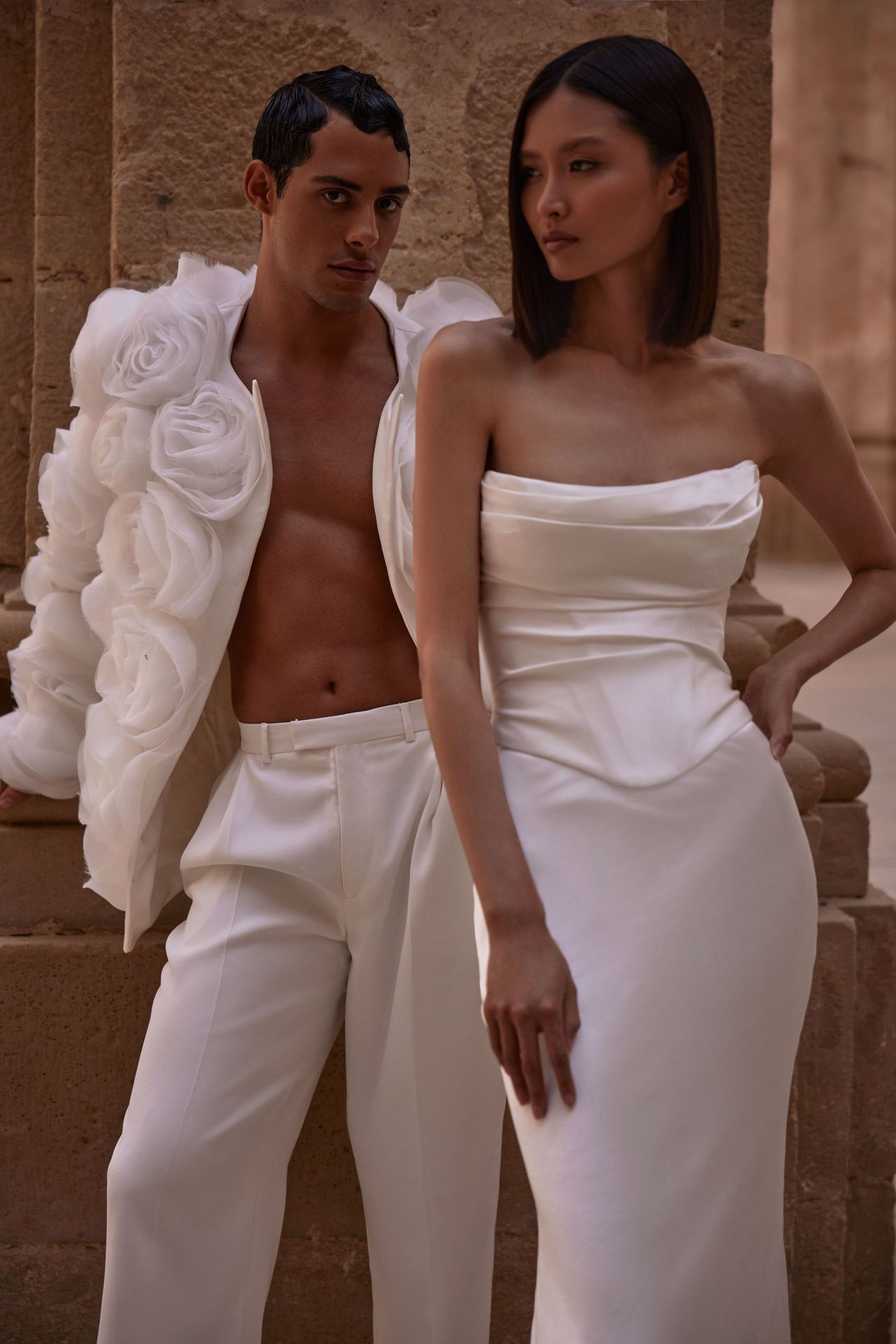 Sophisticated strapless wedding gown crafted from luxurious silk. Featuring a sleek slip silhouette, a boned corset on a zipper that cinches the waist, a draped neckline, and a fitted maxi skirt with a short train. The corset features a double-layered design, with an additional shaping corset sewn within.
