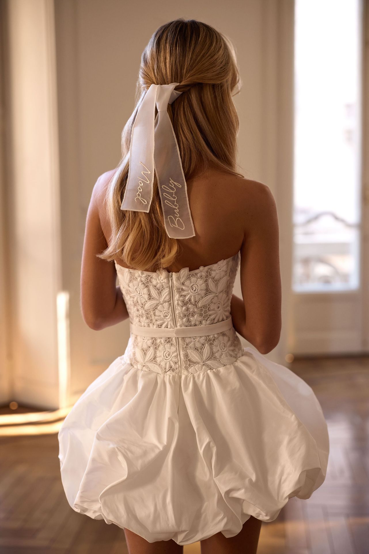 Fashion-forward wedding mini dress with a bubble skirt. Featuring a structured corset bodice fashioned from lace with camomile floral ornament, detachable off-the-shoulder sleeves, a waist belt, a closed zipper back, and a bubble skirt crafted from crisp taffeta.