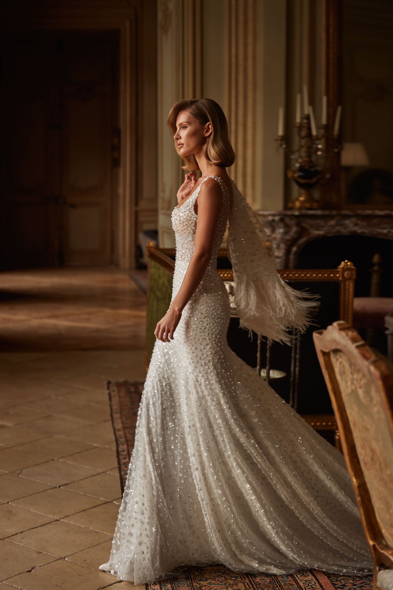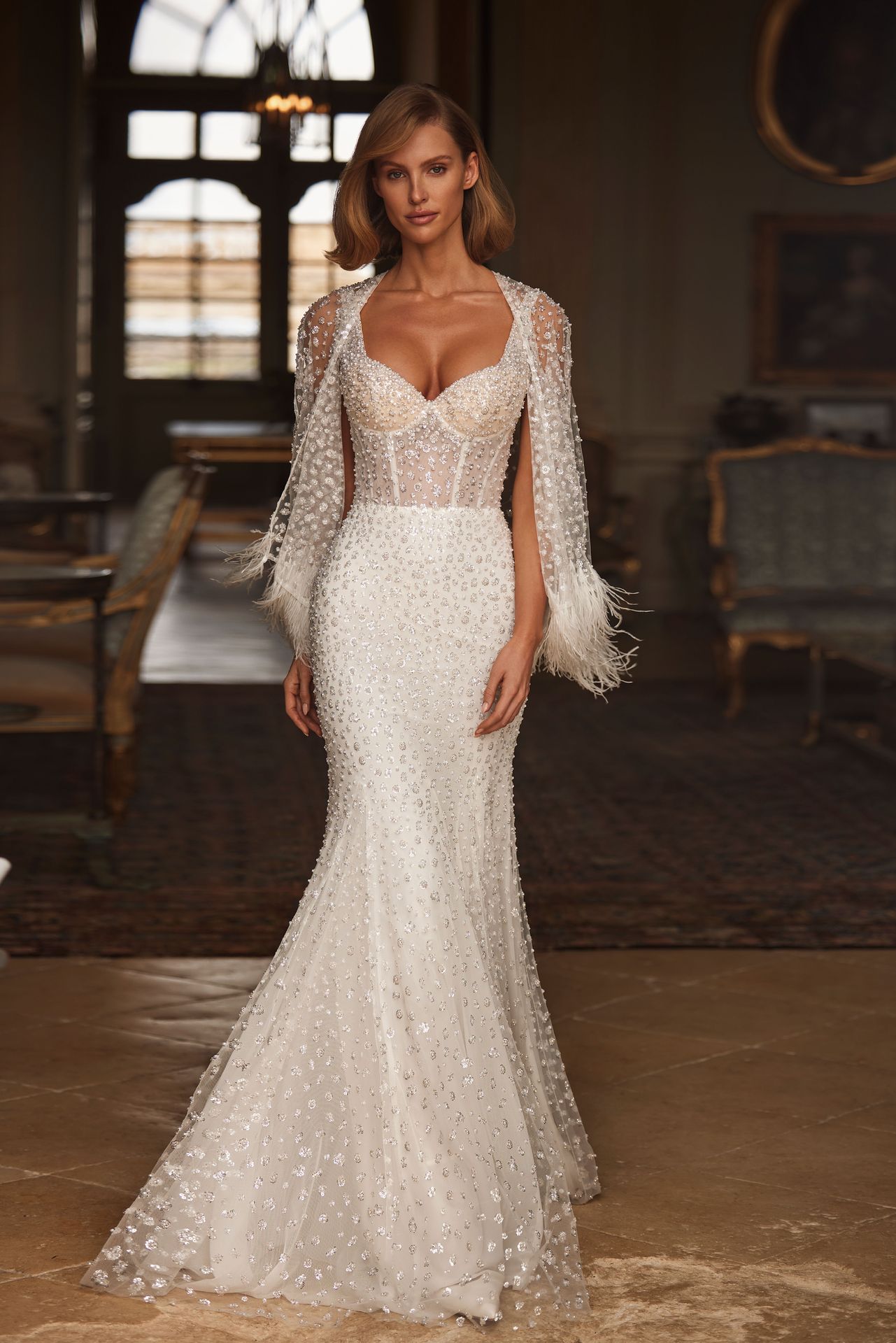 Bolero de manga larga llamativo, adornado a mano con perlas, lentejuelas y plumas de avestruz. Las lentejuelas y perlas crean embellecimientos florales, mientras que las plumas aportan acentos impactantes que elevan el conjunto.
