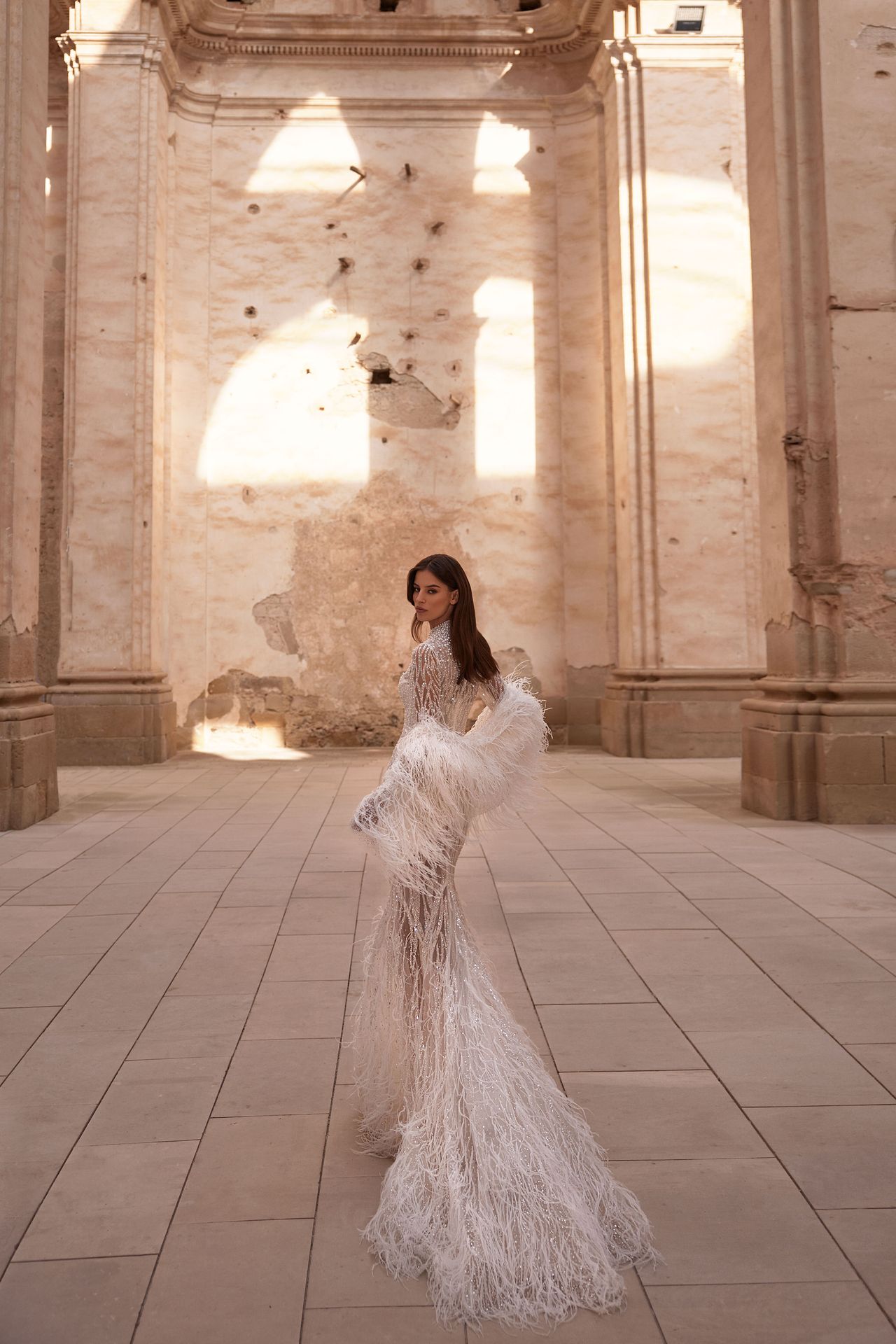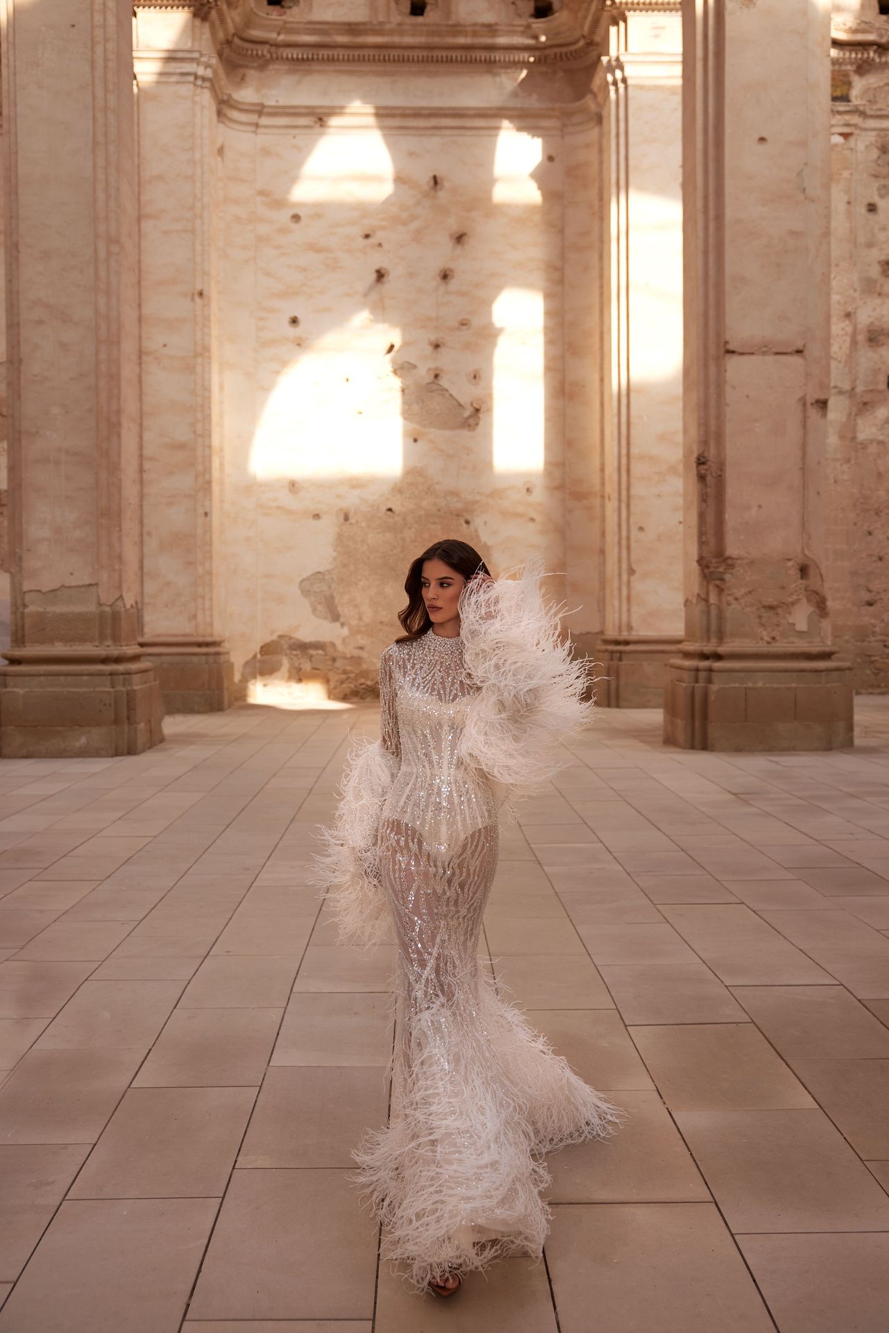 Bolero protagonista adornado a mano con plumas de avestruz. Las delicadas plumas actúan como acento, formando un punto focal cautivador que eleva la belleza de la novia.