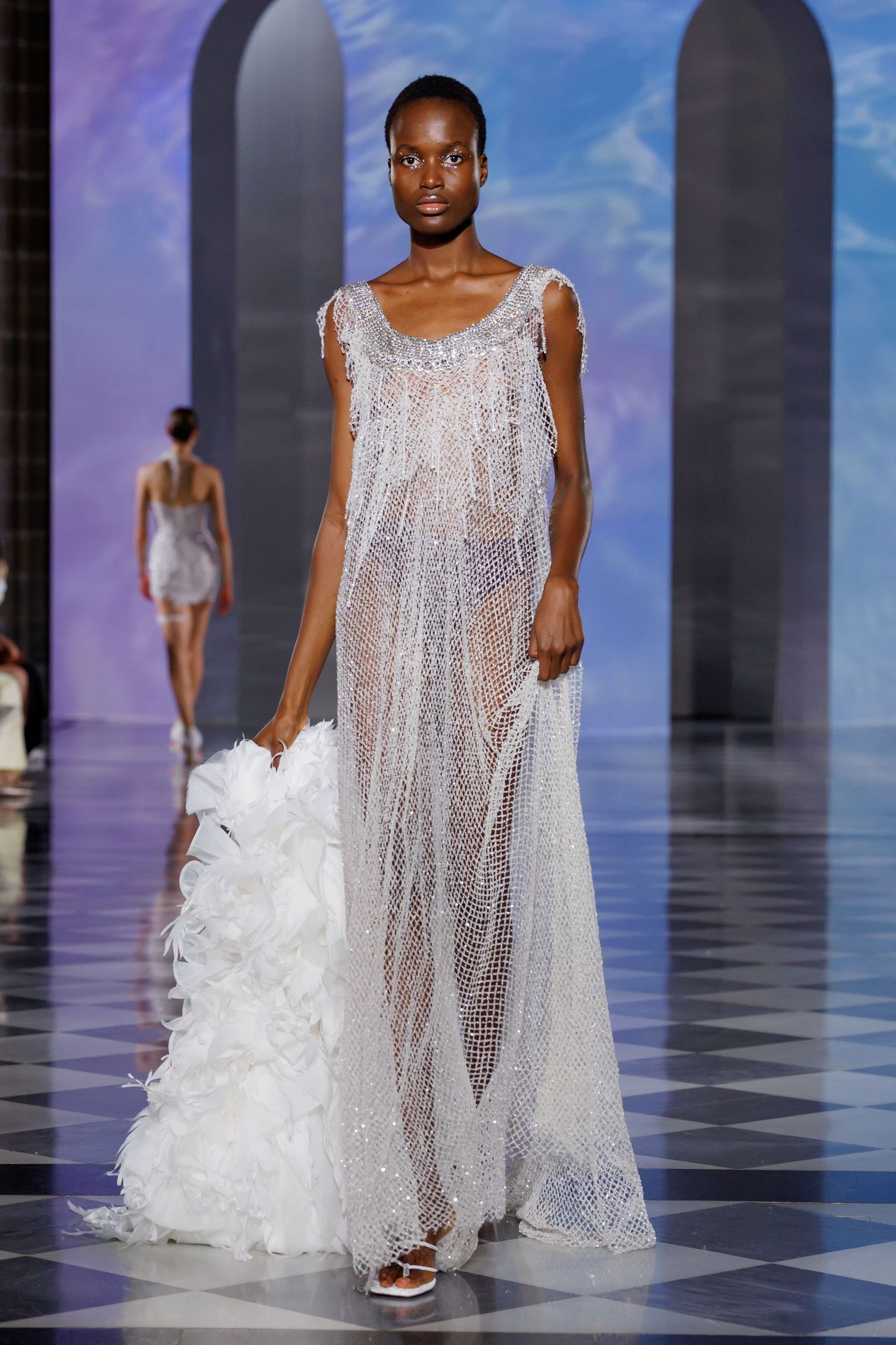Capa de plumas de carácter singular, elaborada a mano a partir de delicadas cintas de organza, diseñadas meticulosamente para imitar plumas etéreas. Cada cinta se cose a mano, reflejando una artesanía impecable. El cuello se adorna con exuberantes volantes de organza, aportando un toque dramático y elegante a cualquier estilismo nupcial.