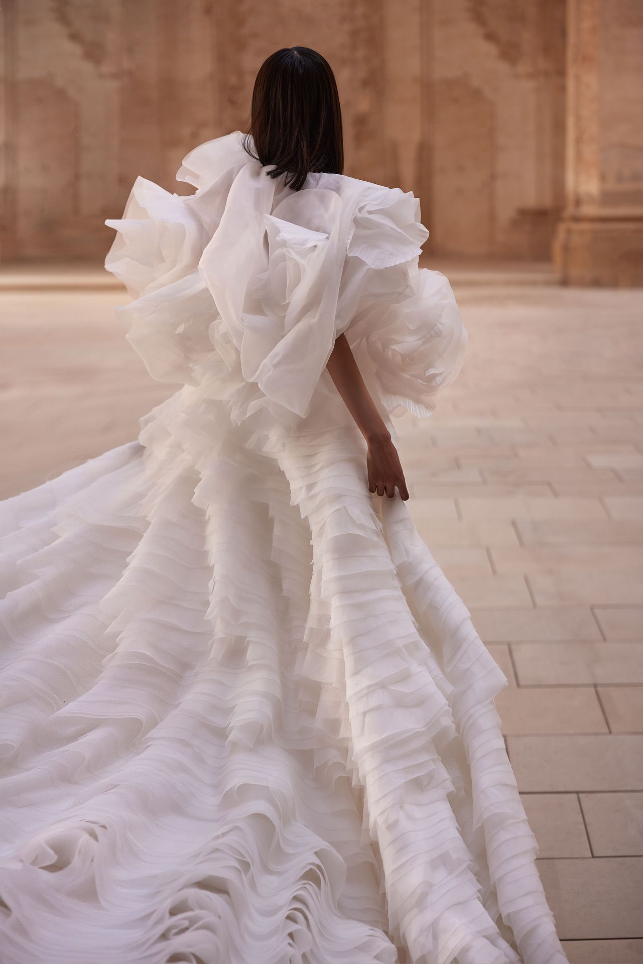 Impactante capa floral de organza con una lujosa cola larga. Presenta flores volumétricas elaboradas a mano en la parte superior que descienden en cascada hacia una elegante cola fruncida. Si busca una declaración de moda audaz, esta capa extravagante debe ser su elección.