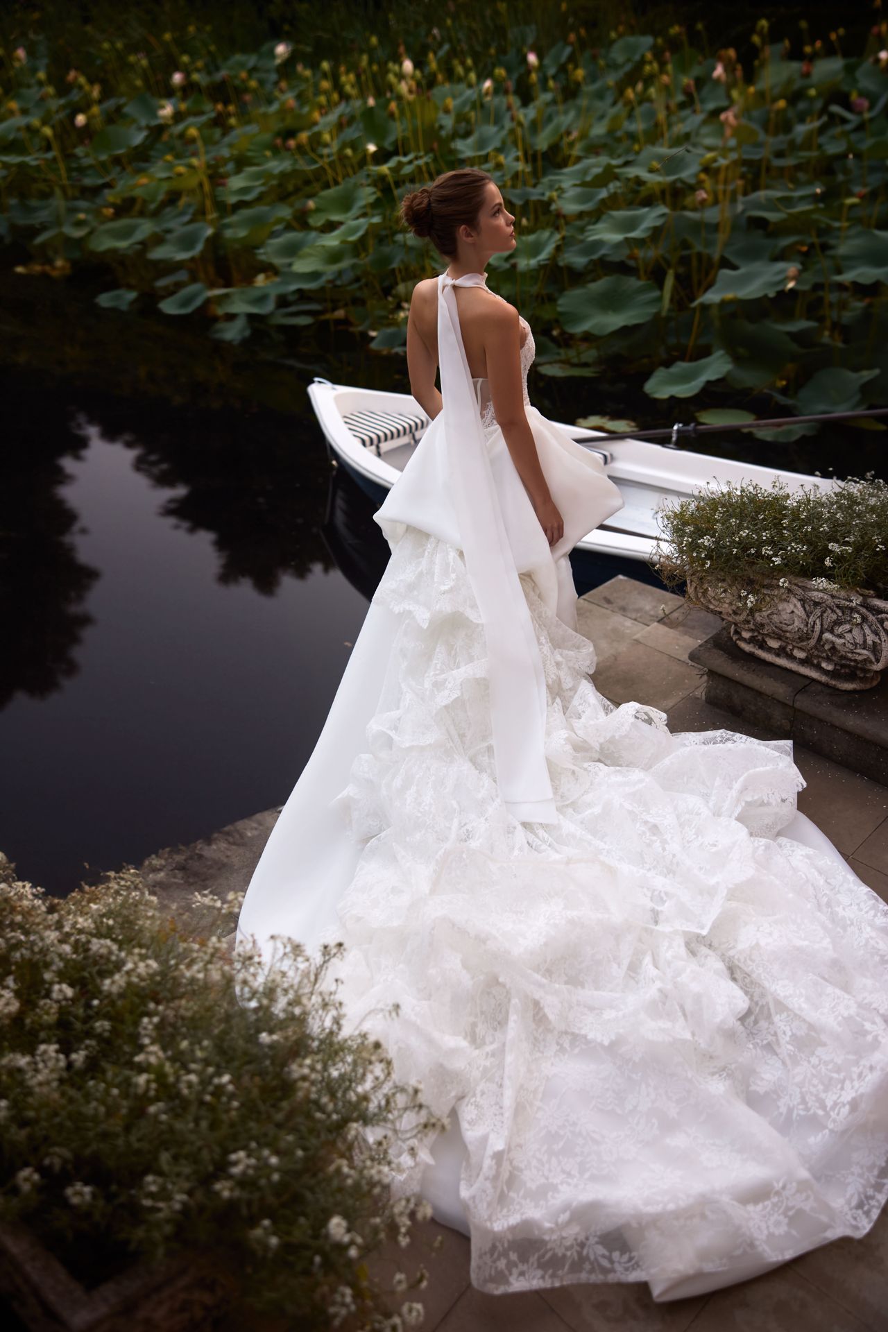 Cola desmontable de ensueño confeccionada en encaje chantilly, con múltiples capas escalonadas de delicado encaje floral que caen con gracia hasta el suelo.