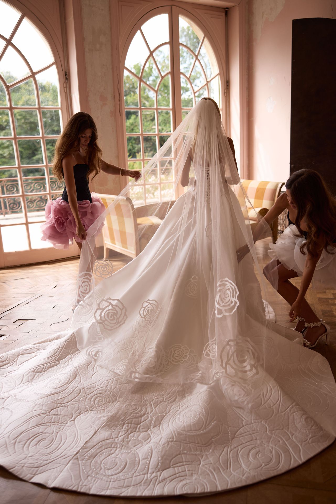 Velo ornamental de tul de una sola capa, cuidadosamente adornado a mano con aplicaciones únicas de rosas que recorren delicadamente todo el borde.