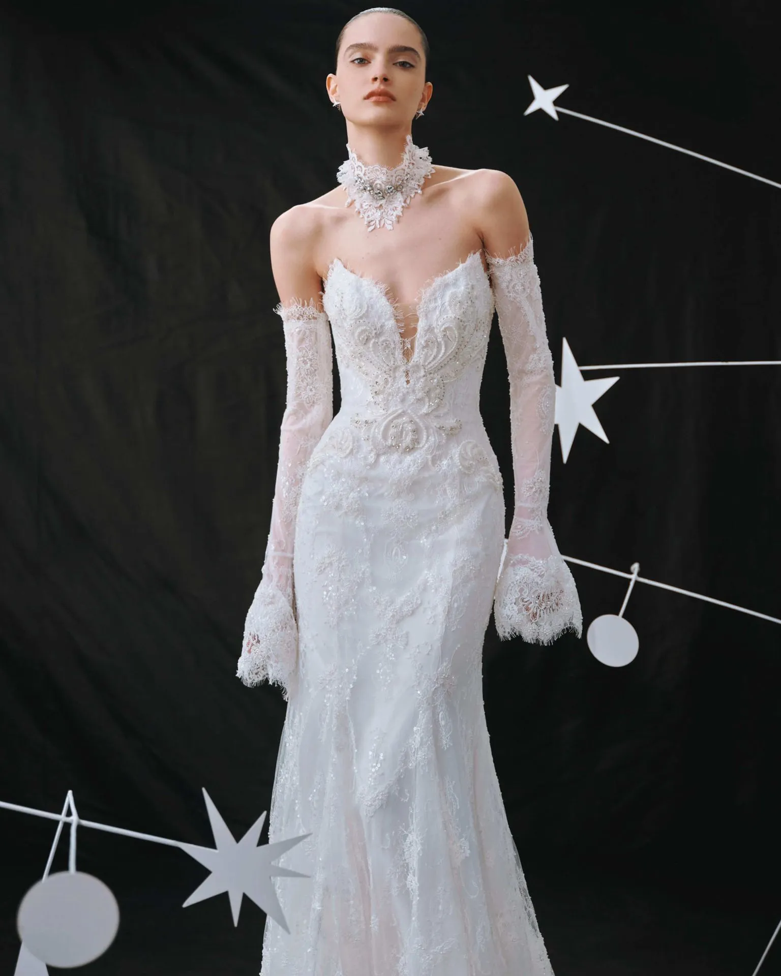 Un llamativo collar tipo gargantilla de encaje chantilly, adornado con cristales y perlas, cuyo diseño realza el escote gracias a sus llamativos detalles. Los bordes puntiagudos del encaje y los brillantes adornos le confieren un carácter sofisticado, inspirado en la joyería, que realza al instante el estilo del conjunto.