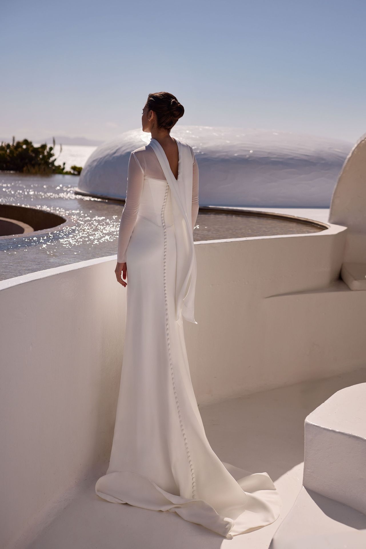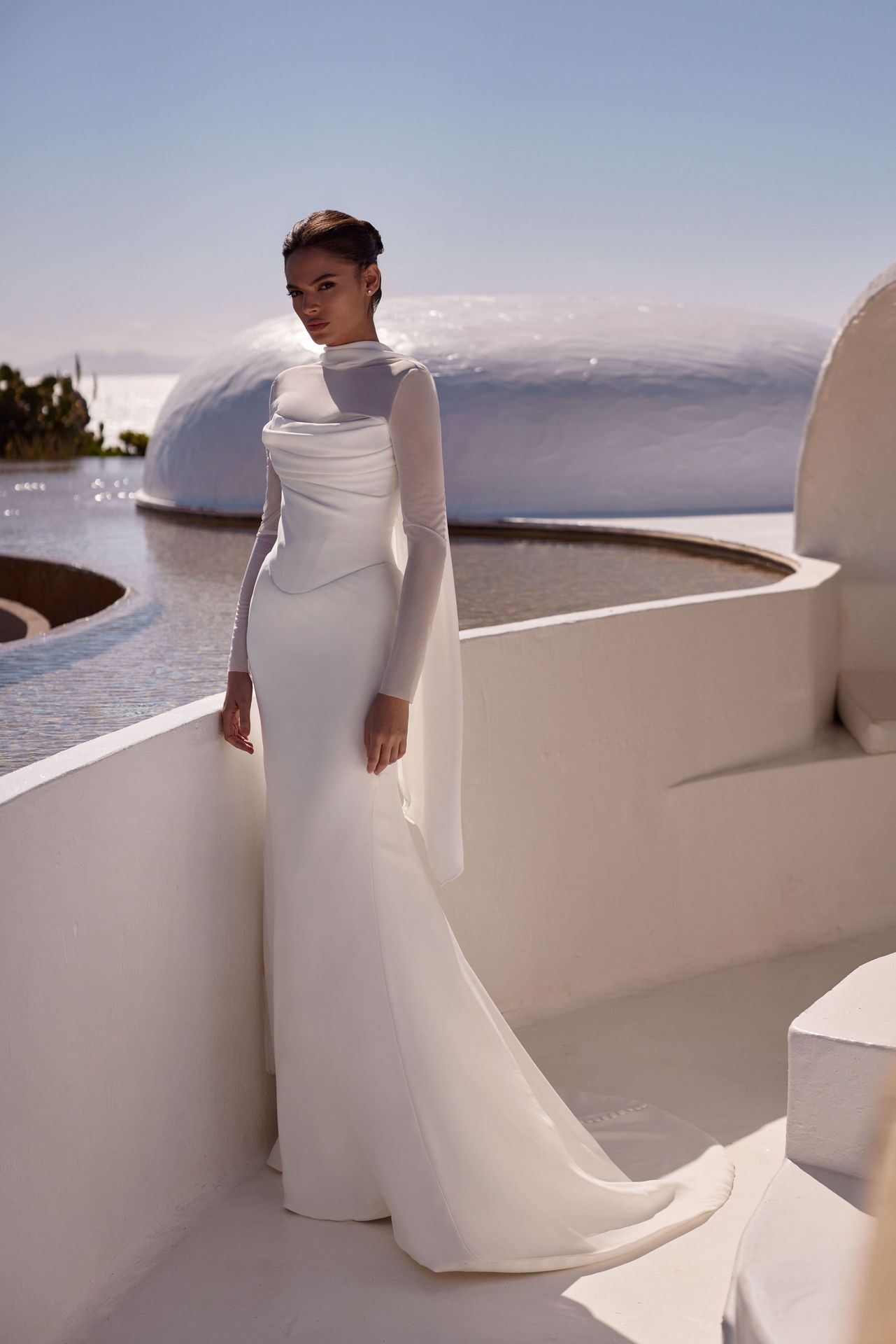 Bolero delicado y translúcido de tul tipo cuello alto, con mangas largas y un detalle de chal fluido en la parte posterior del cuello. Ideal para estilismos versátiles y looks en capas.