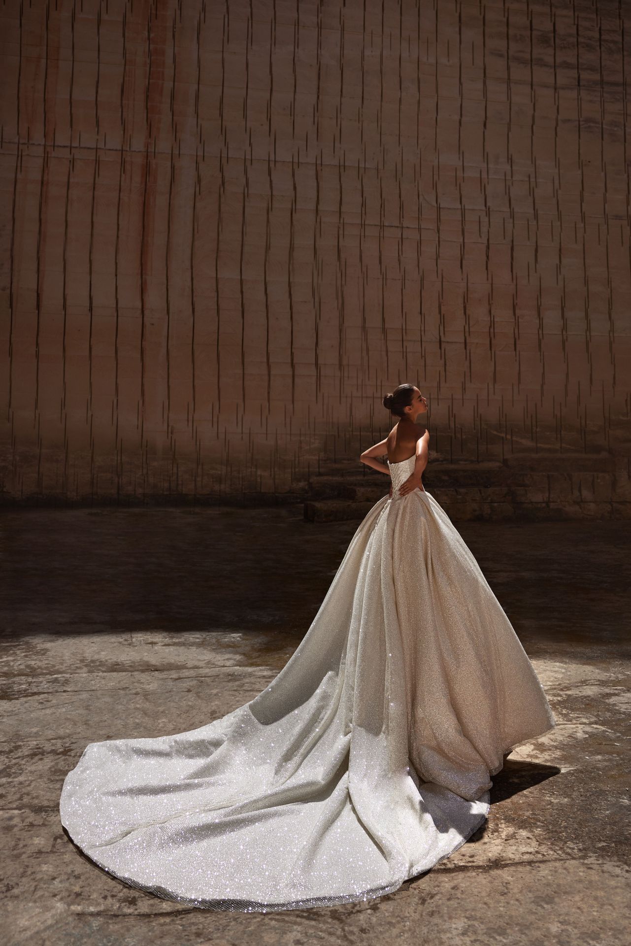 Exuberante vestido de novia estilo princesa completamente cubierto de brillo. Presenta un corsé palabra de honor de cintura baja y ajuste ceñido, con escote geométrico adornado con cristales en la parte superior. El conjunto se completa con una falda voluminosa y luminosa con una elegante cola larga. Puede complementarse con el collar escalonado de pedrería Antonia.