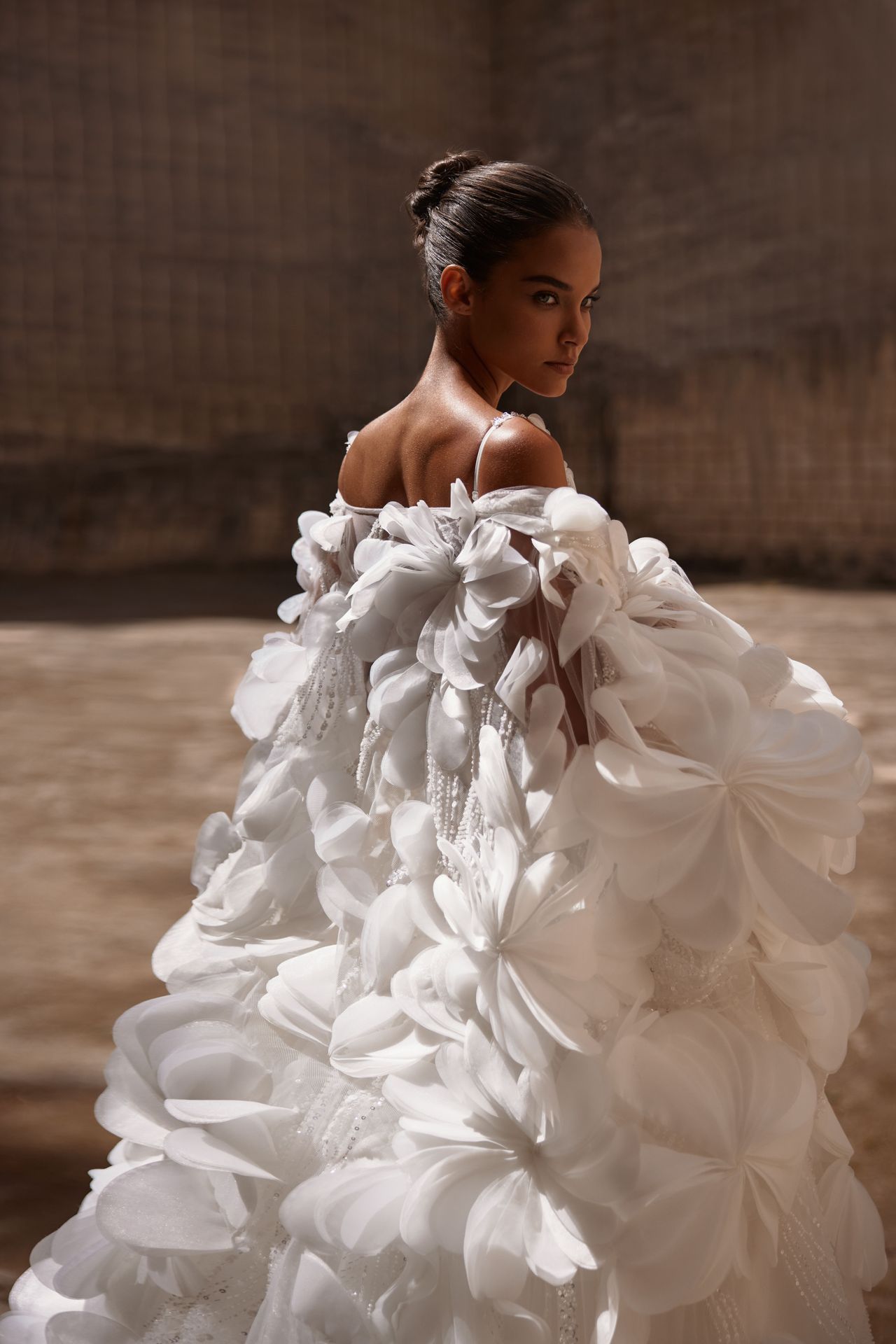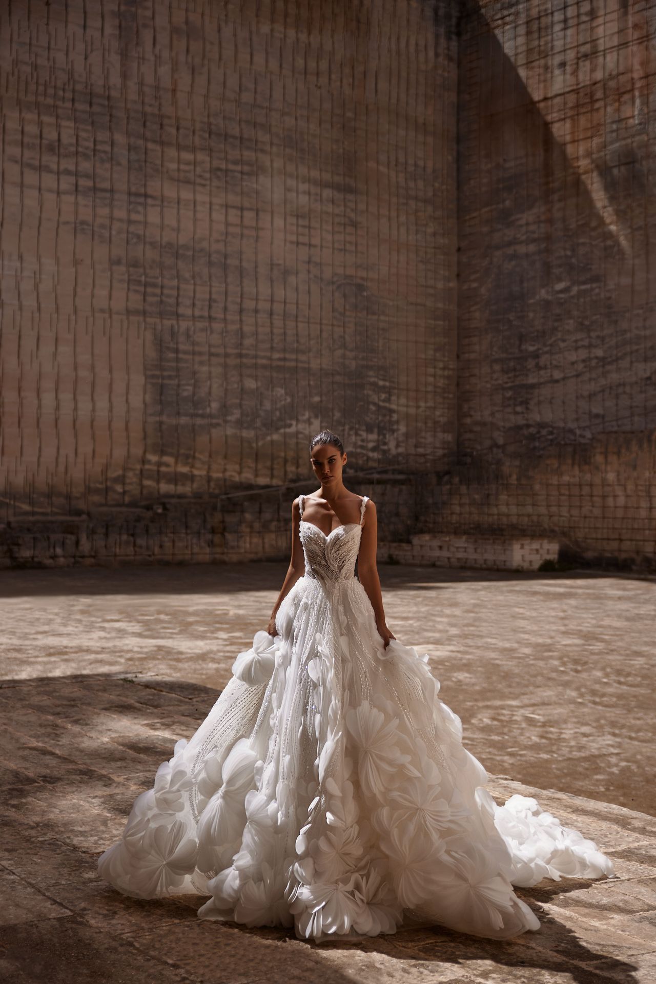 Vestido de novia de tul etéreo adornado con flores de encaje 3D hechas a mano. Presenta un corsé semitransparente con varillas y escote corazón sobre tirantes espagueti, adornado con aplicaciones florales 3D, perlas y lentejuelas que caen elegantemente desde el cuerpo hasta la falda, formando un lujoso y brillante campo de flores que culmina en la parte inferior del vestido con flores volumétricas meticulosamente elaboradas a mano. El vestido puede combinarse con el bolero Ashlyn y el velo Ashlyn.