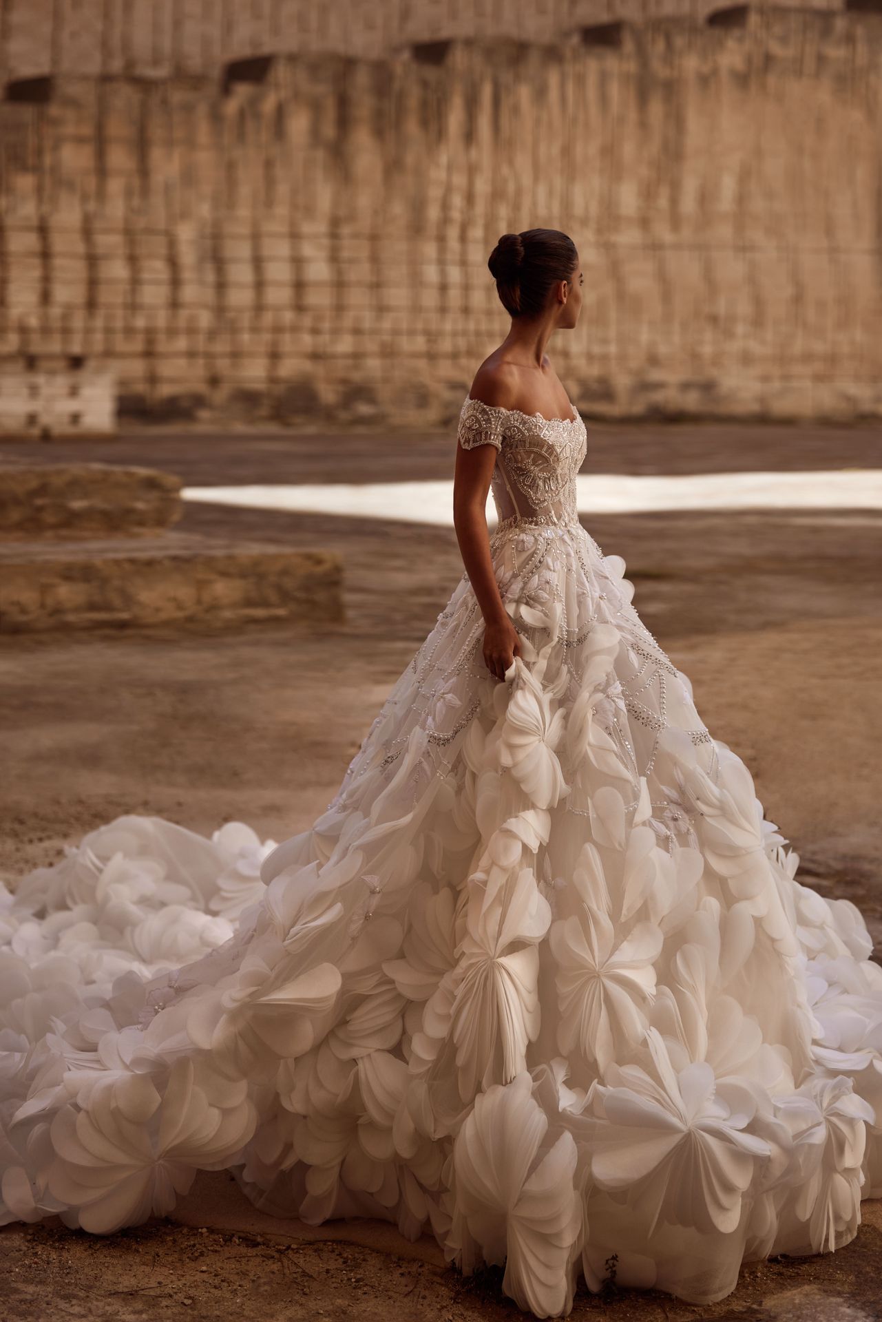 Extravagante vestido de novia en línea A de tul, adornado a mano con una intrincada ornamentación de lentejuelas, perlas y pedrería, y flores 3D volumétricas hechas a mano. Presenta un corsé semitransparente con varillas adornado con un ornamento brillante elegantemente pintado desde el cuello hasta el cuerpo, mientras que aplicaciones florales 3D de tul florecen en la falda y culminan en la parte inferior y en una cola extremadamente larga.