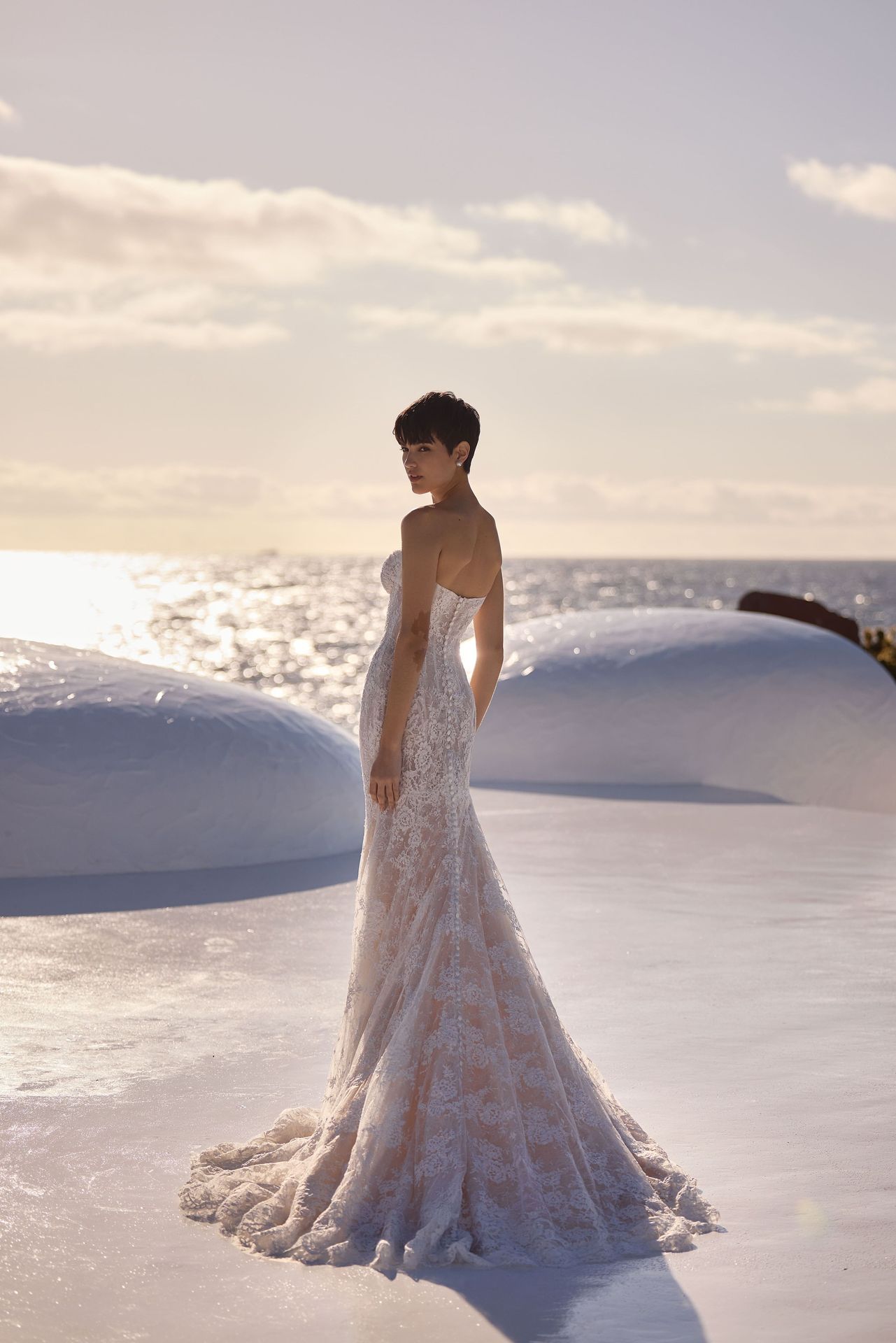 Etéreo vestido de novia en línea A confeccionado en tul ligero. Presenta finos tirantes que se prolongan en alas de tul, evocando la estética de una diosa griega. El cuerpo de escote corazón con copas integradas está artísticamente drapeado, creando un patrón de texturas entrelazadas. La espalda cerrada con cremallera oculta garantiza un ajuste seguro, mientras que la falda de tul en capas termina en una suave cola corta.