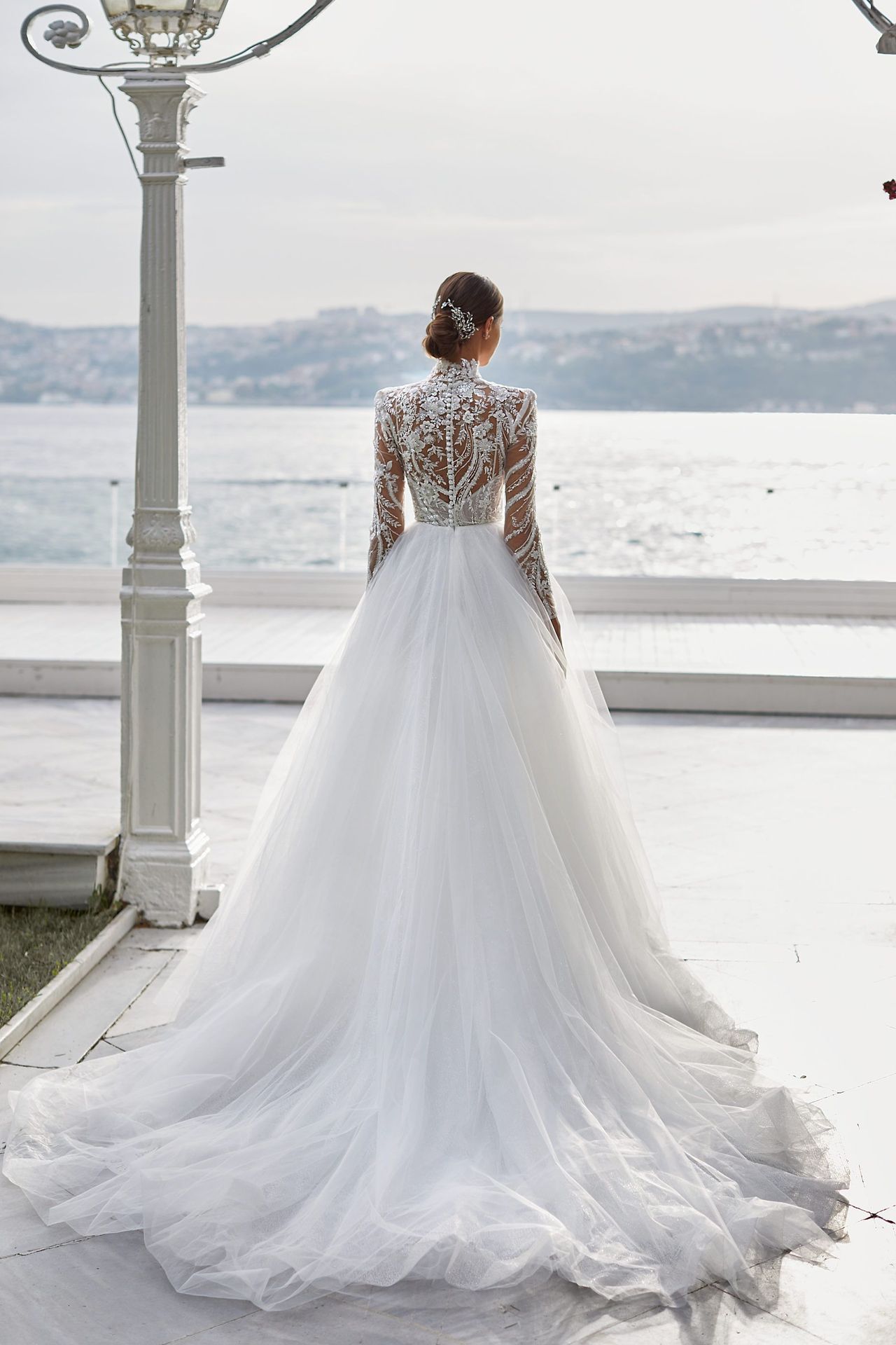 Elegante vestido de gala de tul de manga larga con cuerpo semitransparente embellecido. Presenta cuello alto, top con aplicaciones de encaje y cierre de botones en la espalda, y una falda de tul abullonada con una larga cola.
