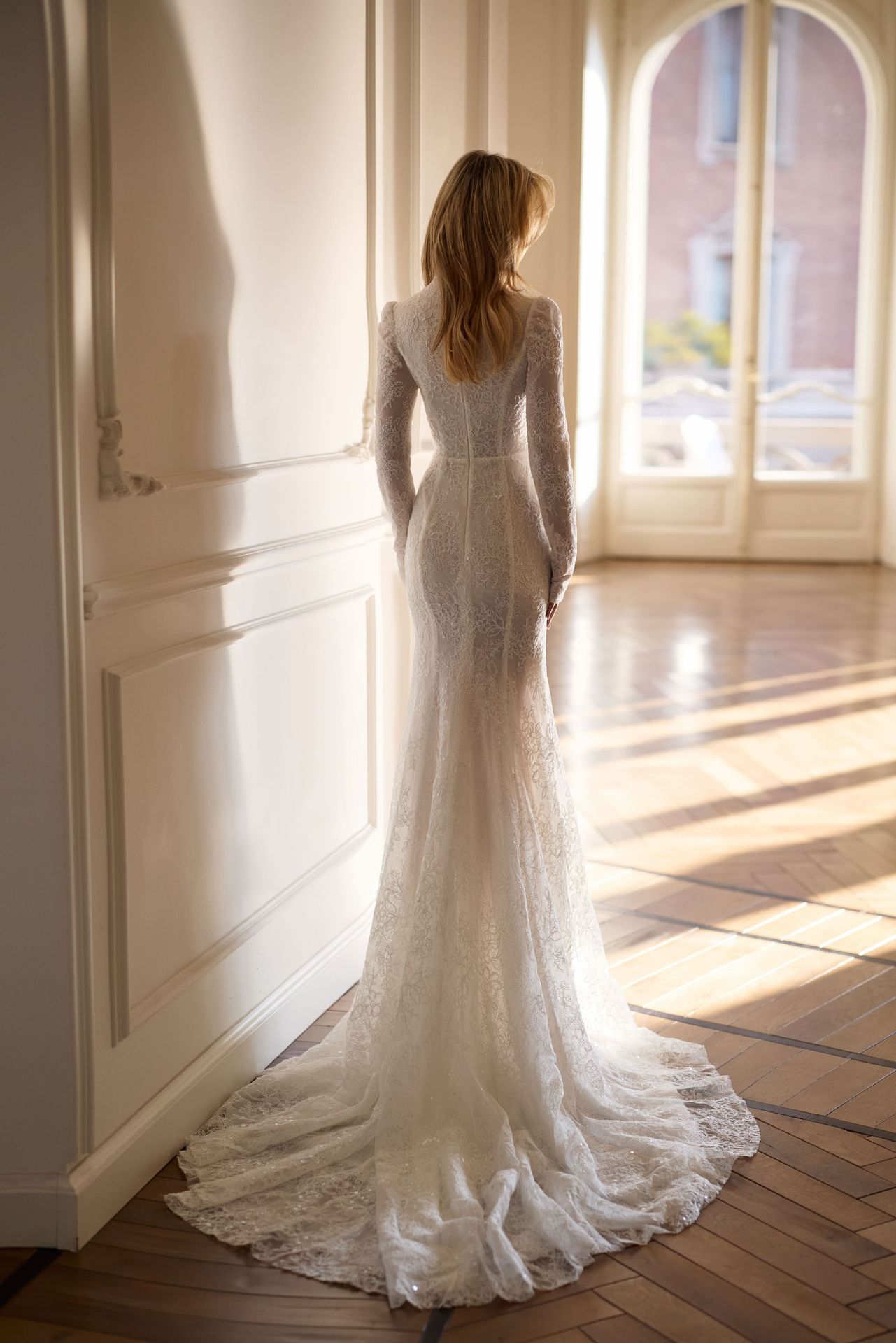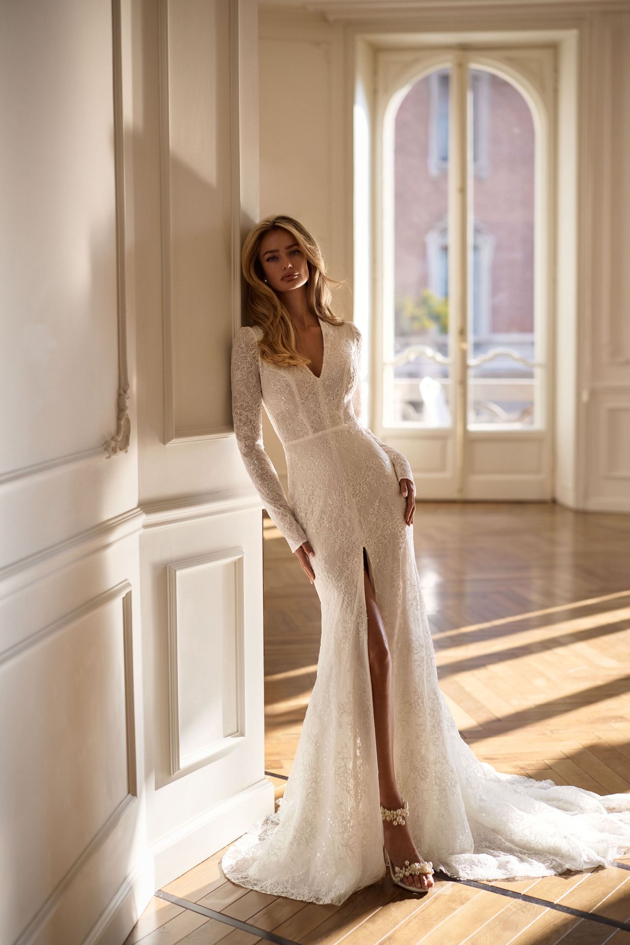 Elegante vestido de novia sirena de manga larga, completamente cubierto de lentejuelas. Confeccionado en encaje floral con intrincados bordados de lentejuelas, presenta un escote en V de líneas precisas, hombros estructurados, mangas largas, cuerpo entallado, espalda cerrada con cremallera y una falda maxi con una atrevida abertura frontal.