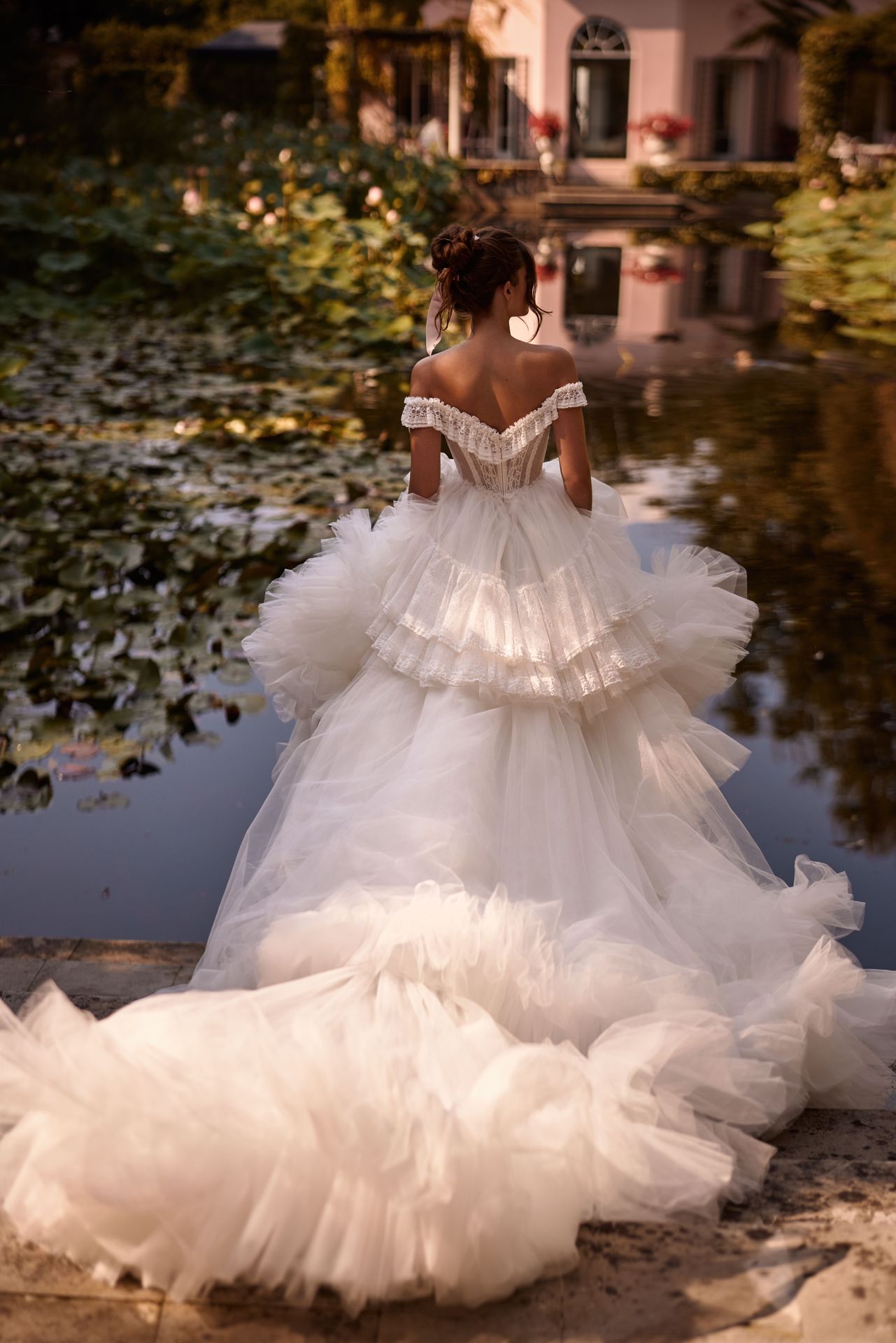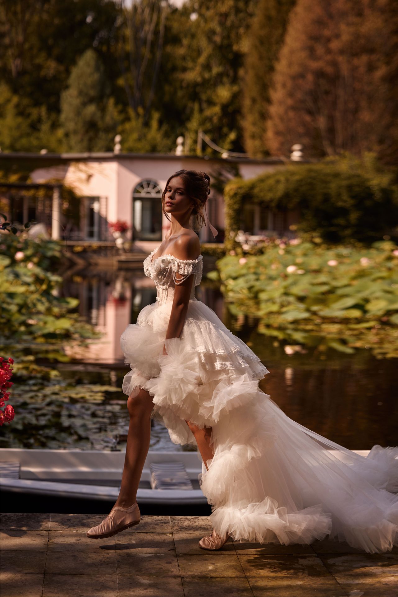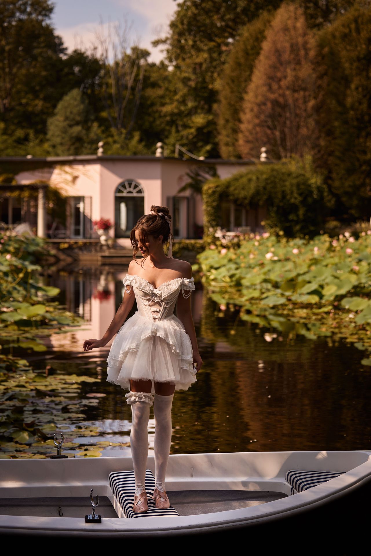 Vestido mini estilo dolly con aire vintage, confeccionado en encaje chantilly. Presenta escote corazón, mangas con hombros descubiertos, cuerpo tipo corsé adornado con frunces estilo Lolita, lazos delicados y detalles de pedrería. Puede combinarse con una falda Christian mini o larga para personalizar el look. Complete el conjunto con el velo corto Christian tipo blusher decorado con lazos.