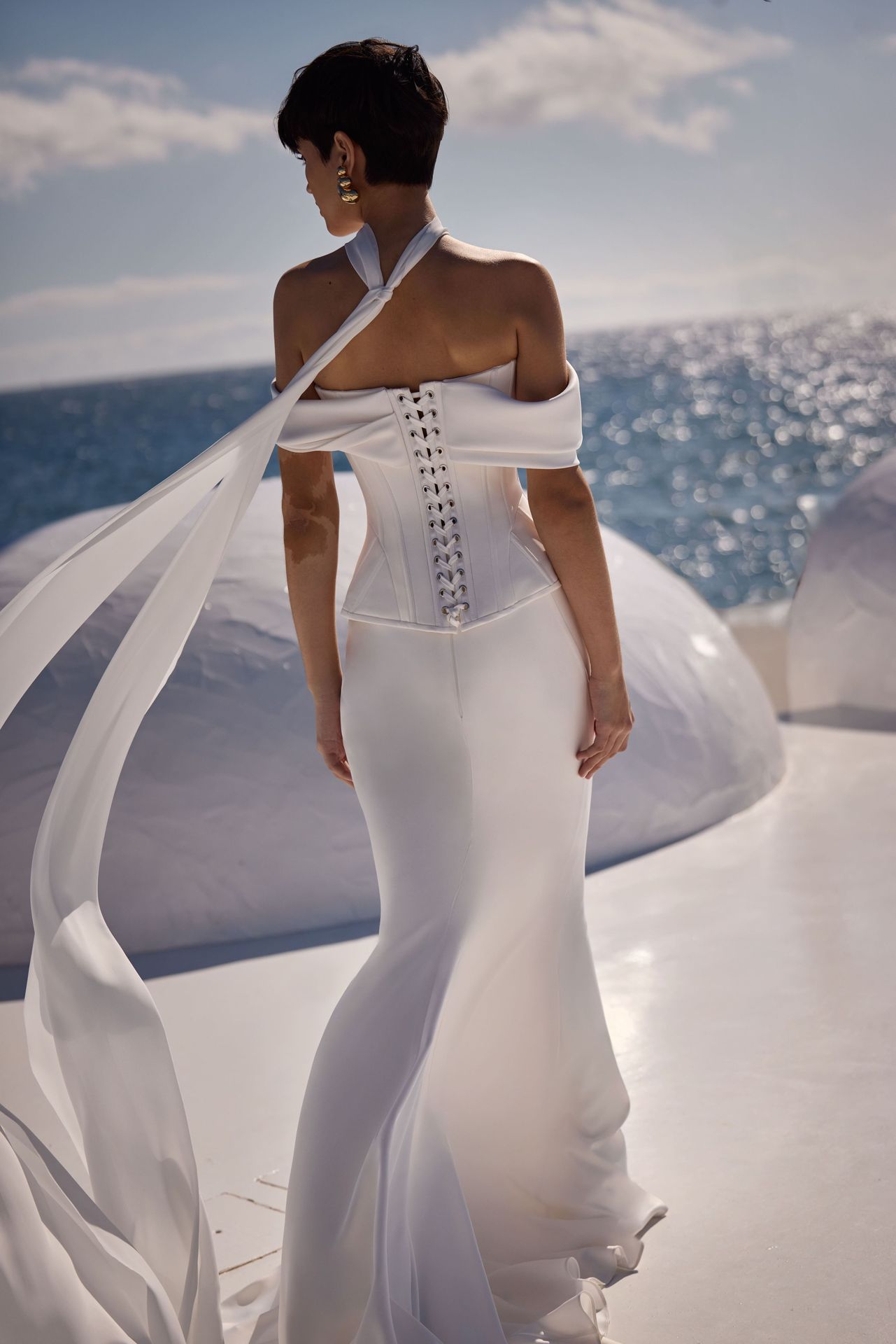 Elegante conjunto nupcial compuesto por un corsé estructurado con varillas que realza la silueta. Presenta un escote corazón y mangas oversize drapeadas con hombros descubiertos, cuidadosamente esculpidas, y cierre de lazada en la espalda. Se combina con una falda sirena de satén depurado que se ajusta al cuerpo y se abre suavemente a partir de la rodilla, creando una silueta sofisticada y atemporal con un brillo lujoso.