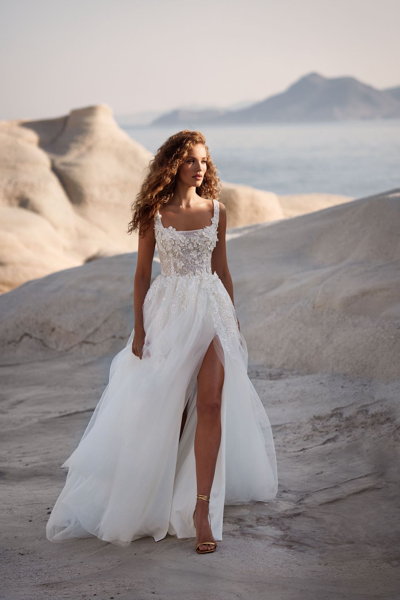 Vestido de tul brillante de corte A con tirantes. Presenta escote y espalda cuadrados, aplicaciones florales 3D con pedrería y una atrevida abertura en el muslo.