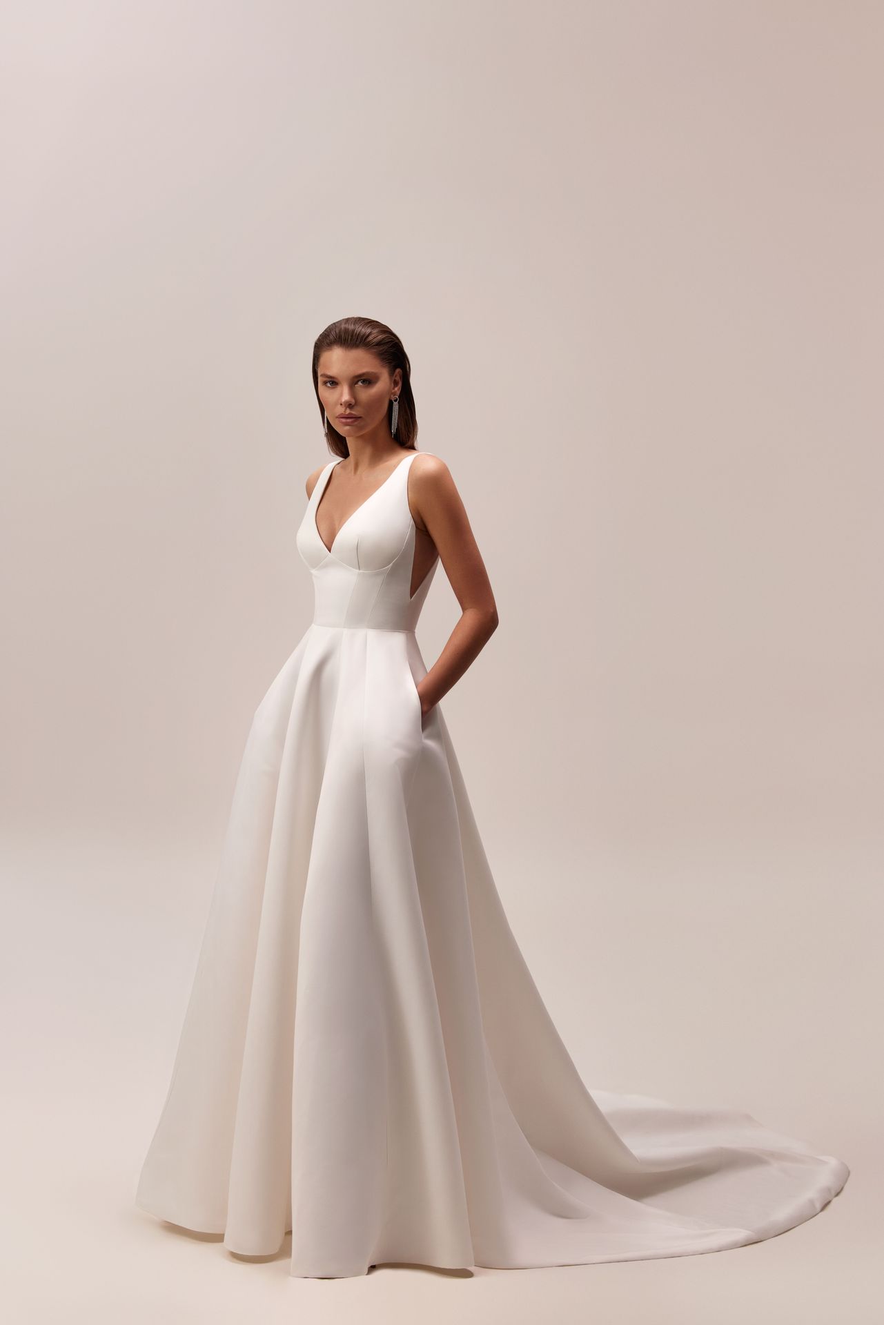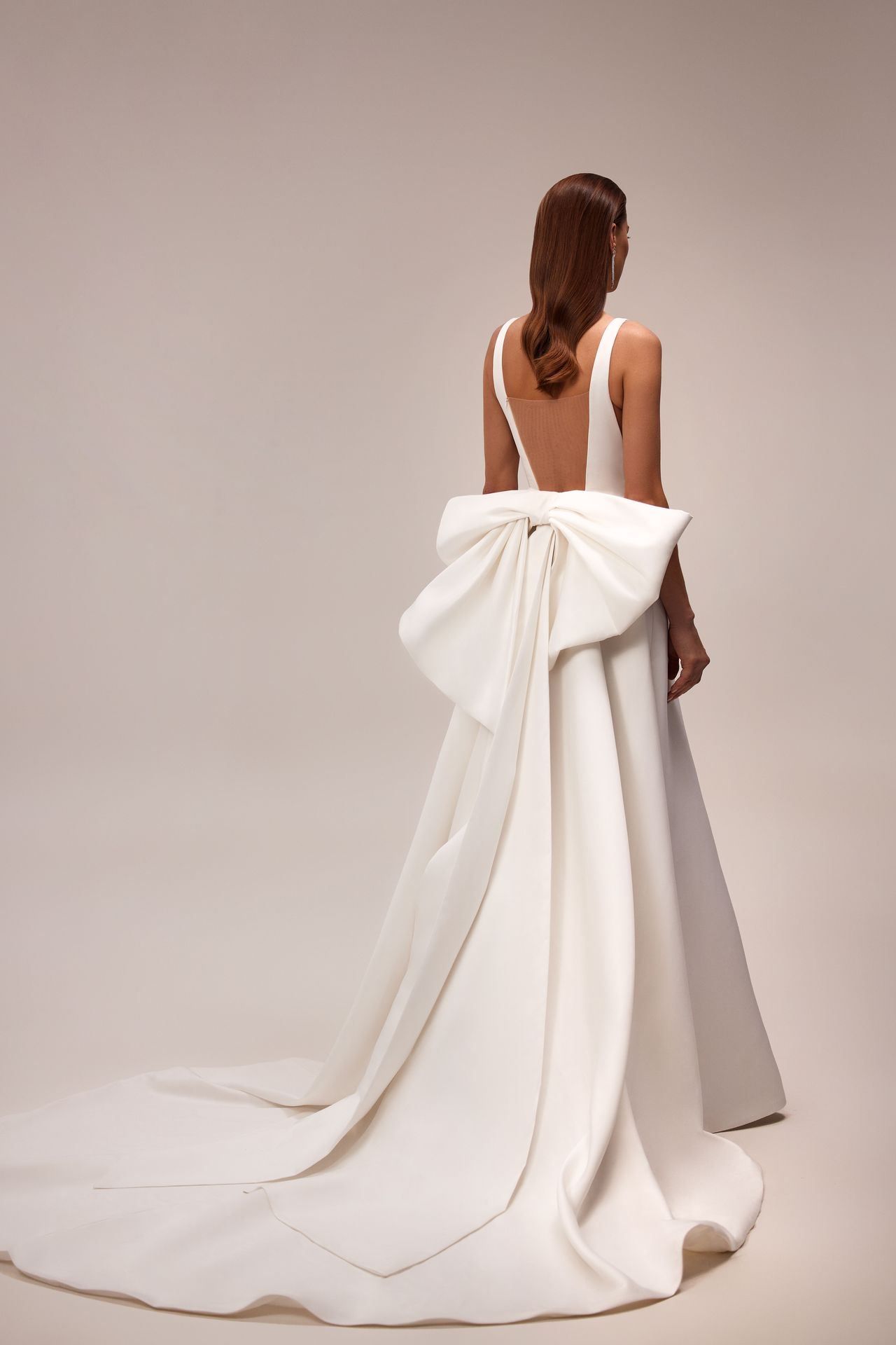 Vestido de novia minimalista de satén con tirantes anchos y escote en V pronunciado, cuerpo tipo corsé y un excepcional lazo volumétrico desmontable en la espalda. La falda maxi completa está confeccionada en satén y presenta una elegante superposición con efecto volumen que flota con el movimiento.