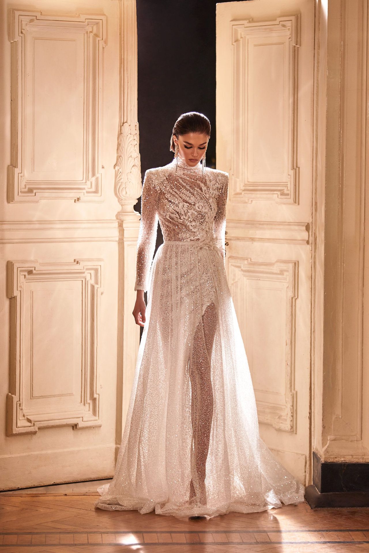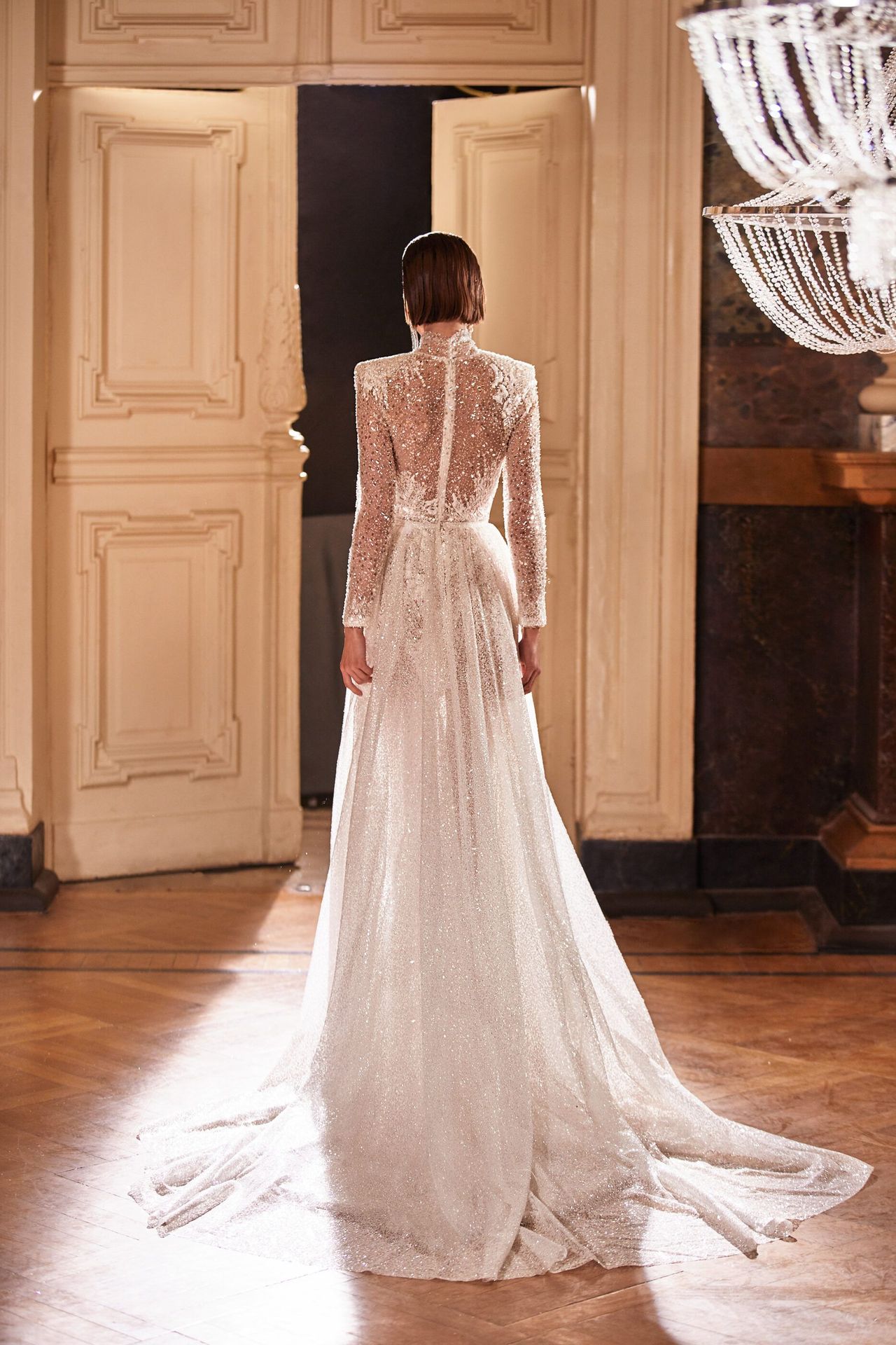 Extravagante vestido de novia semitransparente completamente bordado con cuentas, en color blanco, con abertura en el muslo. Presenta cuello alto, mangas largas y espalda abierta con lentejuelas. Se complementa con una sobrefalda desmontable de tul o una sobrefalda desmontable con volante tipo peplum.