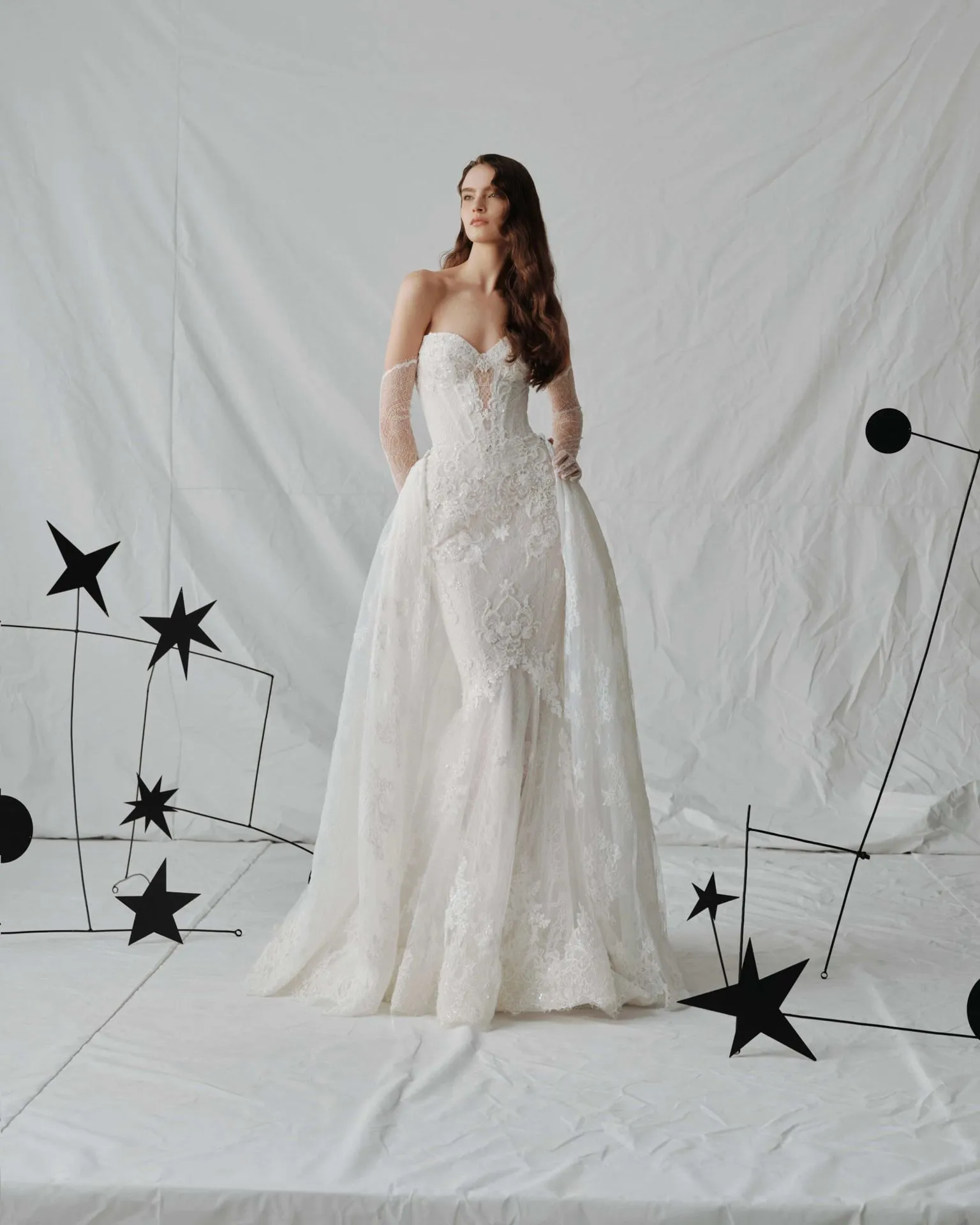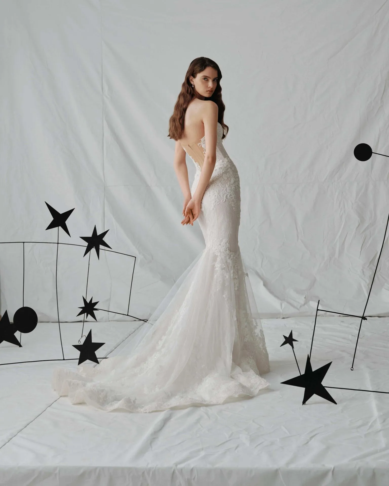 Un vestido de corte sirena confeccionado en encaje chantilly con una silueta entallada que realza y estiliza la figura. El corpiño ajustado se funde con una espectacular falda, mientras que el delicado encaje y las sutiles lentejuelas le aportan textura y un brillo discreto con cada movimiento.
