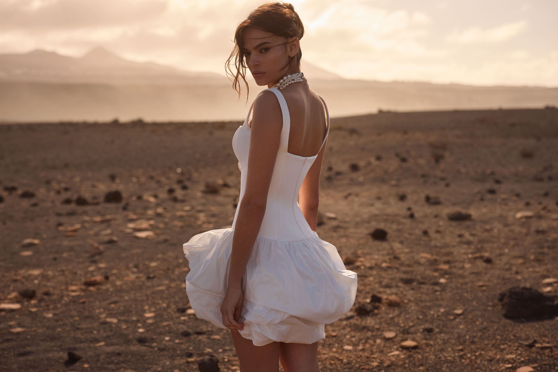 Vestido mini de novia listo para bailar, con una falda burbuja de carácter lúdico. Presenta un escote cuadrado, corsé de cintura baja con tirantes que se ajusta a la figura, líneas sutiles que realzan visualmente las curvas, cierre de cremallera discreto en la espalda y una falda mini burbuja de gran volumen. Una opción perfecta como segundo look nupcial o como propuesta principal para una novia de estilo más moderno.