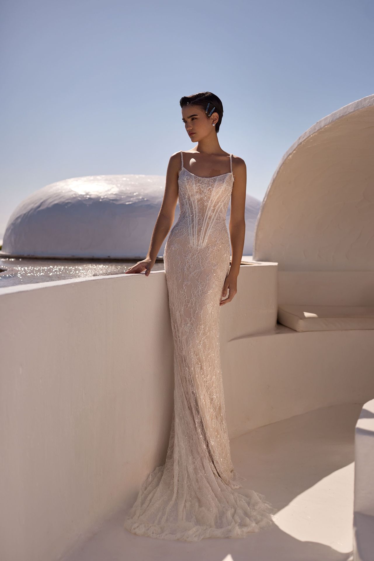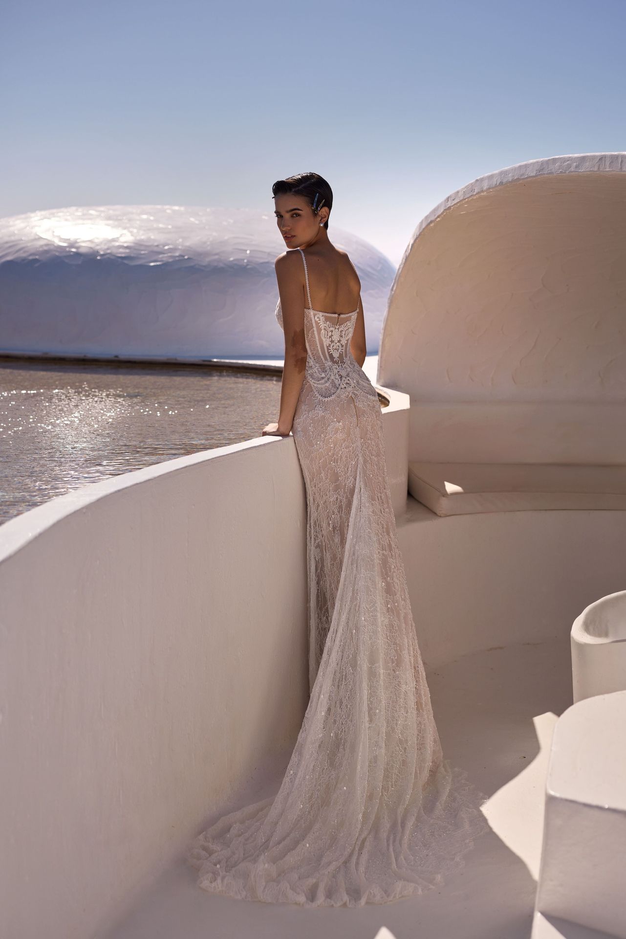 Delicado vestido de novia semitransparente confeccionado en encaje intrincado con motivos florales calados, diseñado en una silueta sirena ceñida y completamente adornado con lentejuelas brillantes. El cuerpo de inspiración corsé presenta varillas visibles y un escote redondeado con finos tirantes espagueti decorados con perlas. La falda ajustada termina en un bajo festoneado y cuenta con un suave forro nude. La espalda cerrada con cremallera luce exquisitos ornamentos florales de encaje y un refinado accesorio de perlas que desciende hasta una cola de encaje.