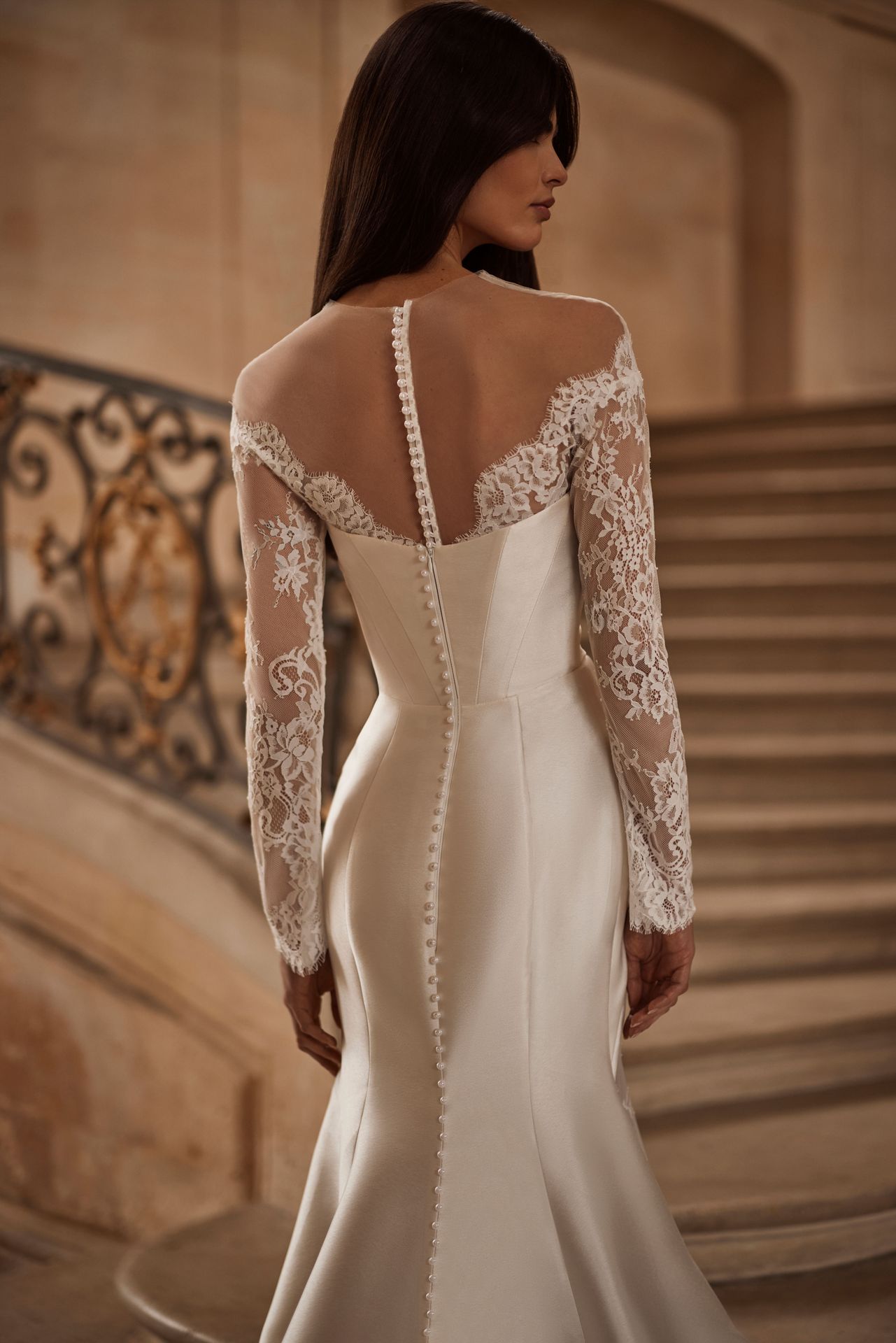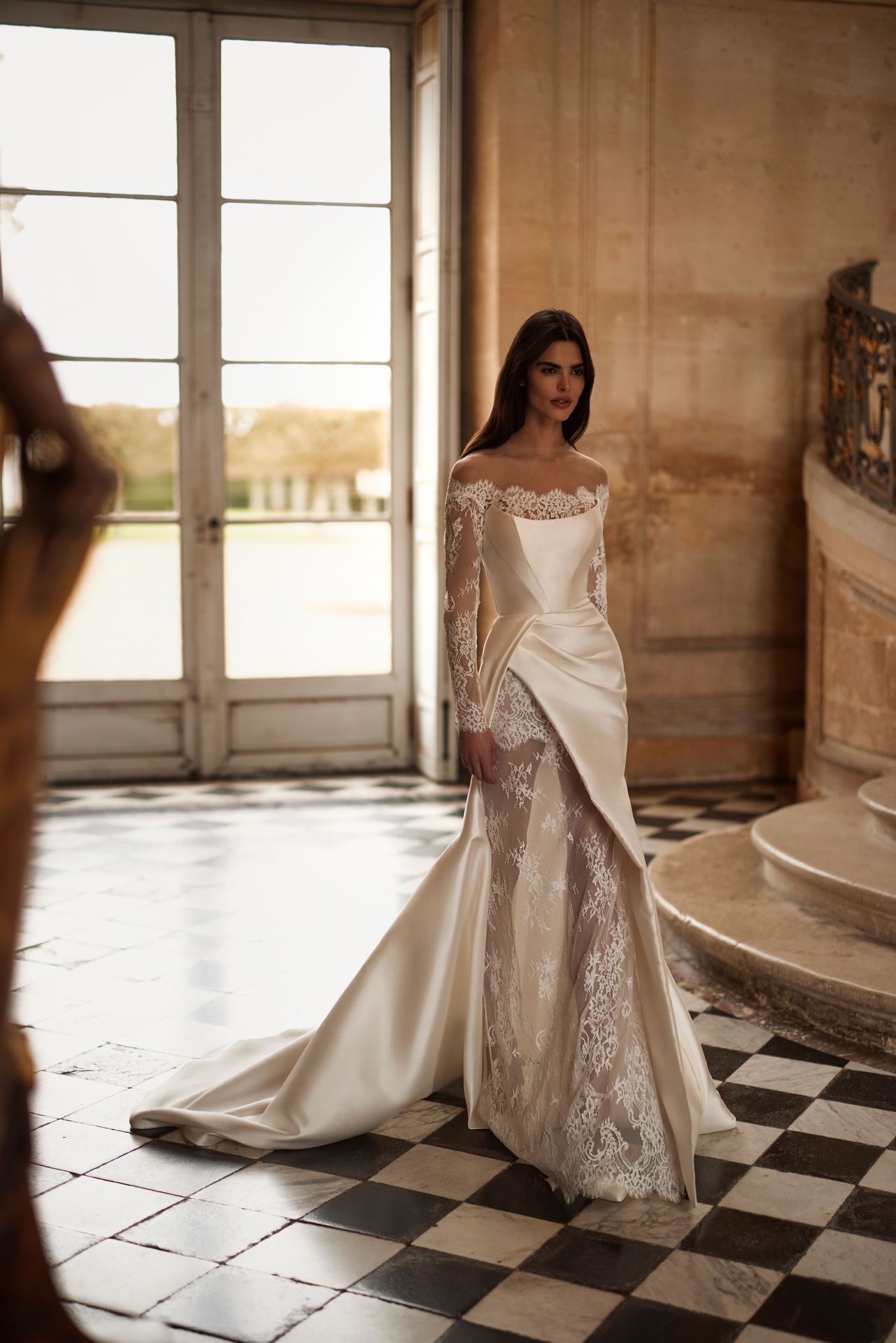 Delikatne przezroczyste bolerko z długim rękawem ozdobione wykwintnym koronkowym motywem kwiatowym nakładanym ręcznie na dekolt w łódkę i długie przezroczyste rękawy.