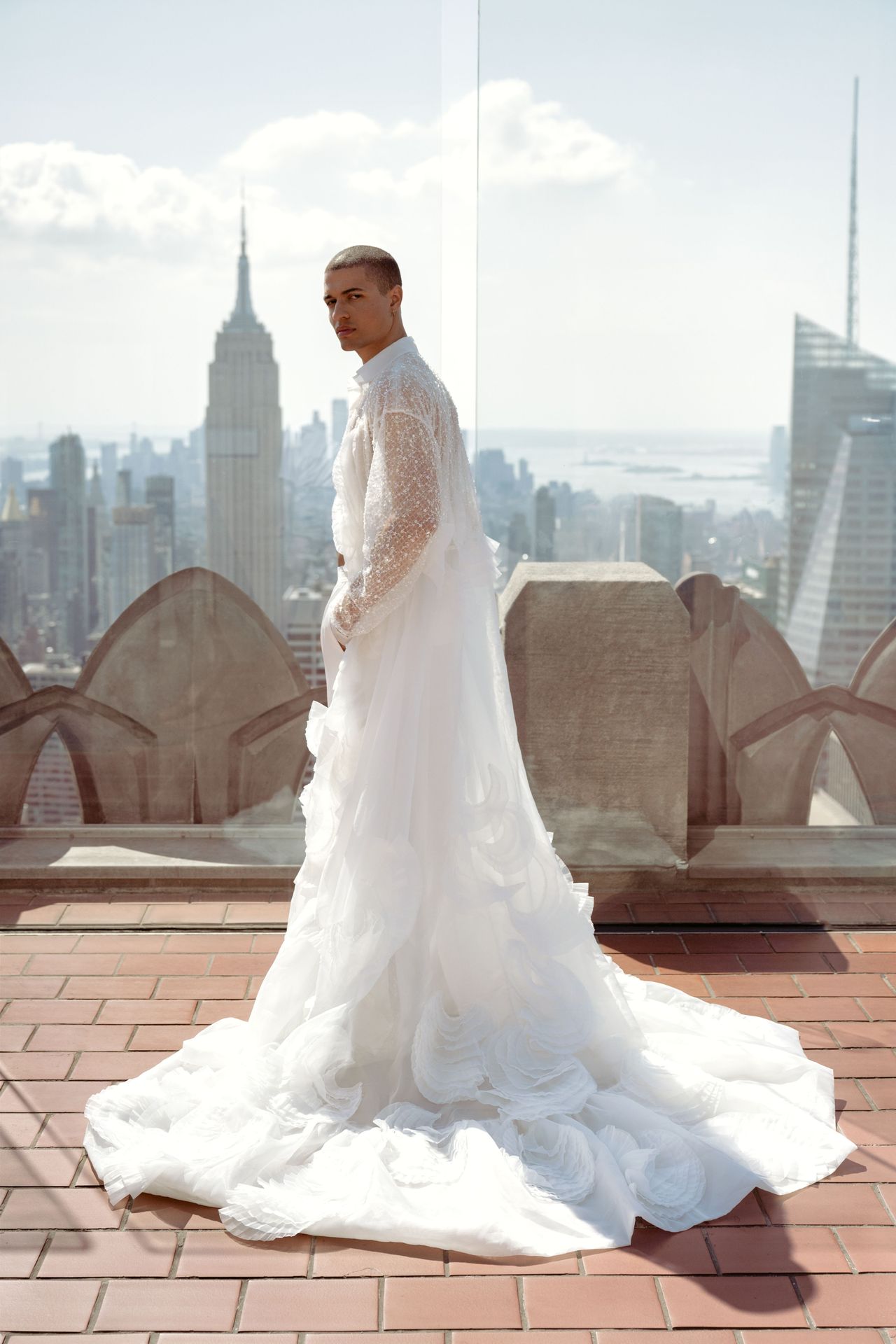 Męski szlafrok o dramatycznej, sięgającej do ziemi sylwetce. Wykonany z przezroczystej, płynącej organzy i ozdobiony misternymi aplikacjami. Góra jest skrojona jak marynarka i wysadzana lśniącymi cekinami, a warstwowe aplikacje kaskadowo opadają wzdłuż szlafroka i tren, tworząc efektowny ruch i artystyczny wyraz.