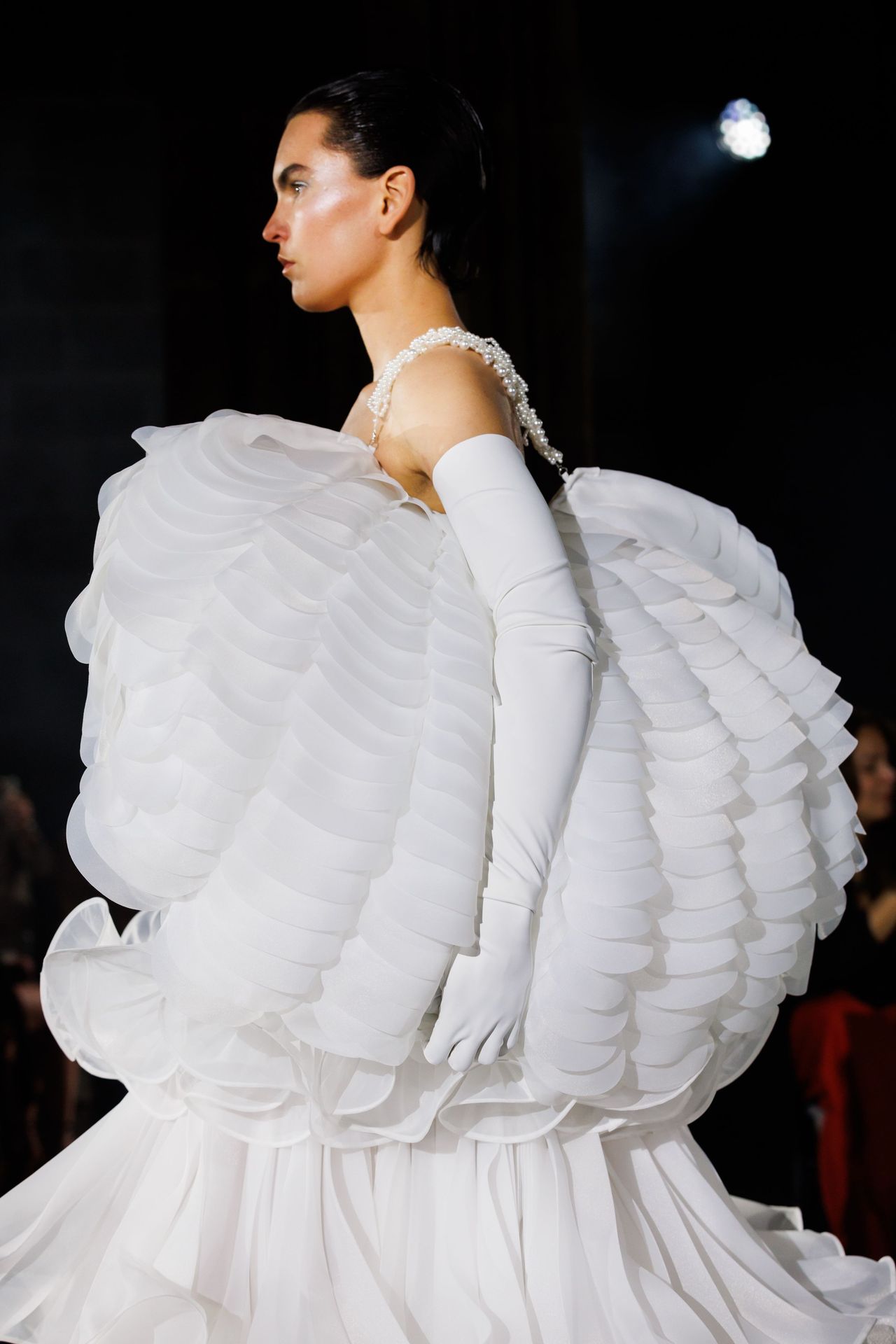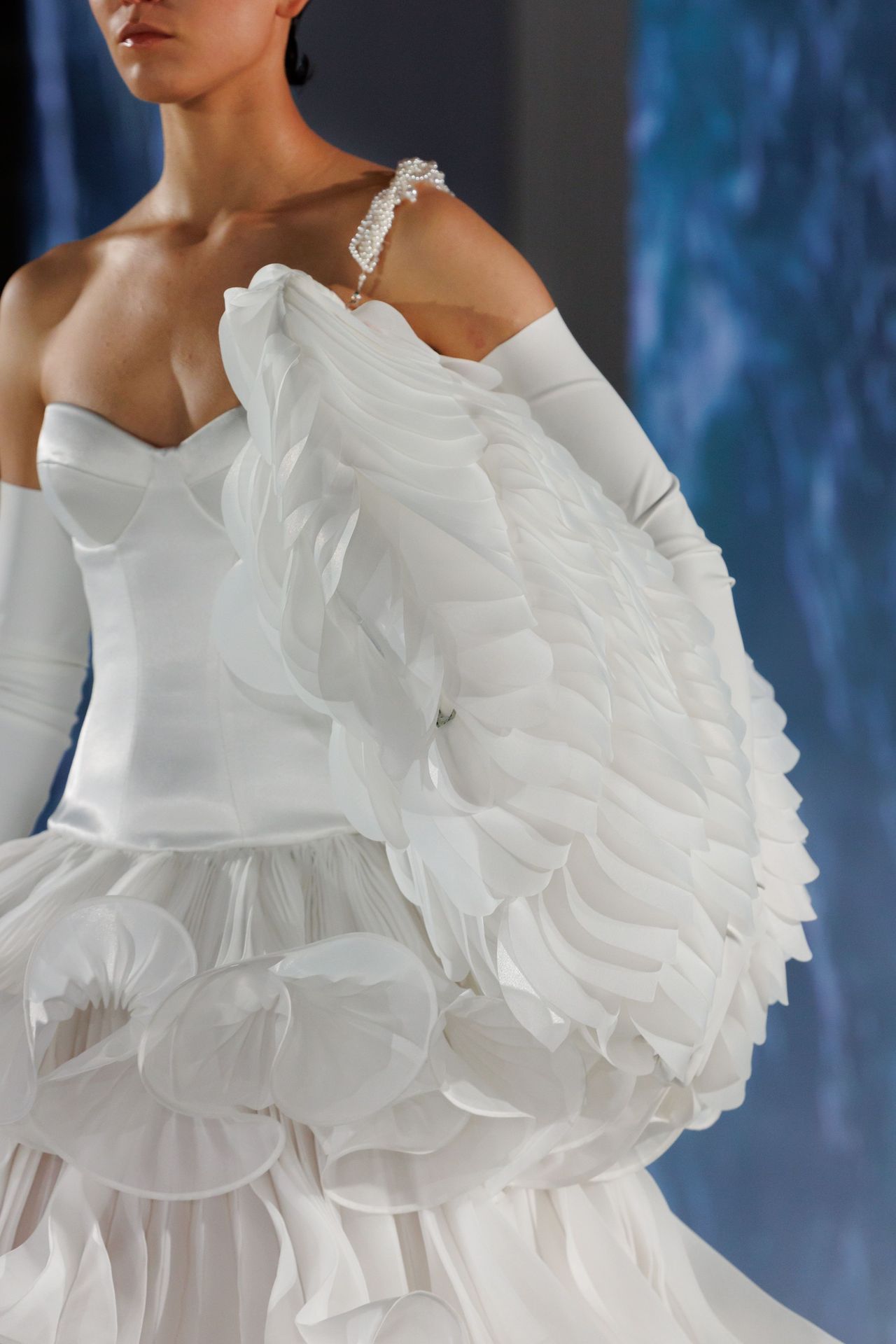 Torebka inspirowana naturalną formą muszli, wykonana z delikatnych płatków organzy i wsparta na eleganckiej metalowej ramie.
