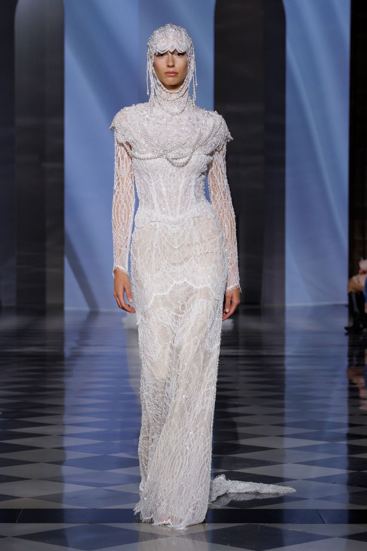 Niezwykły ręcznie haftowany kaptur ślubny, wykonany z drobiazgową precyzją przy użyciu sztuki haftu Luneville. Kaptur jest bogato zdobiony błyszczącymi perłami, mieniącymi się kryształkami i mieniącymi się koralikami, wszystkie misternie wyszywane ręcznie, aby stworzyć zapierający dech w piersiach szczegółowy wzór.