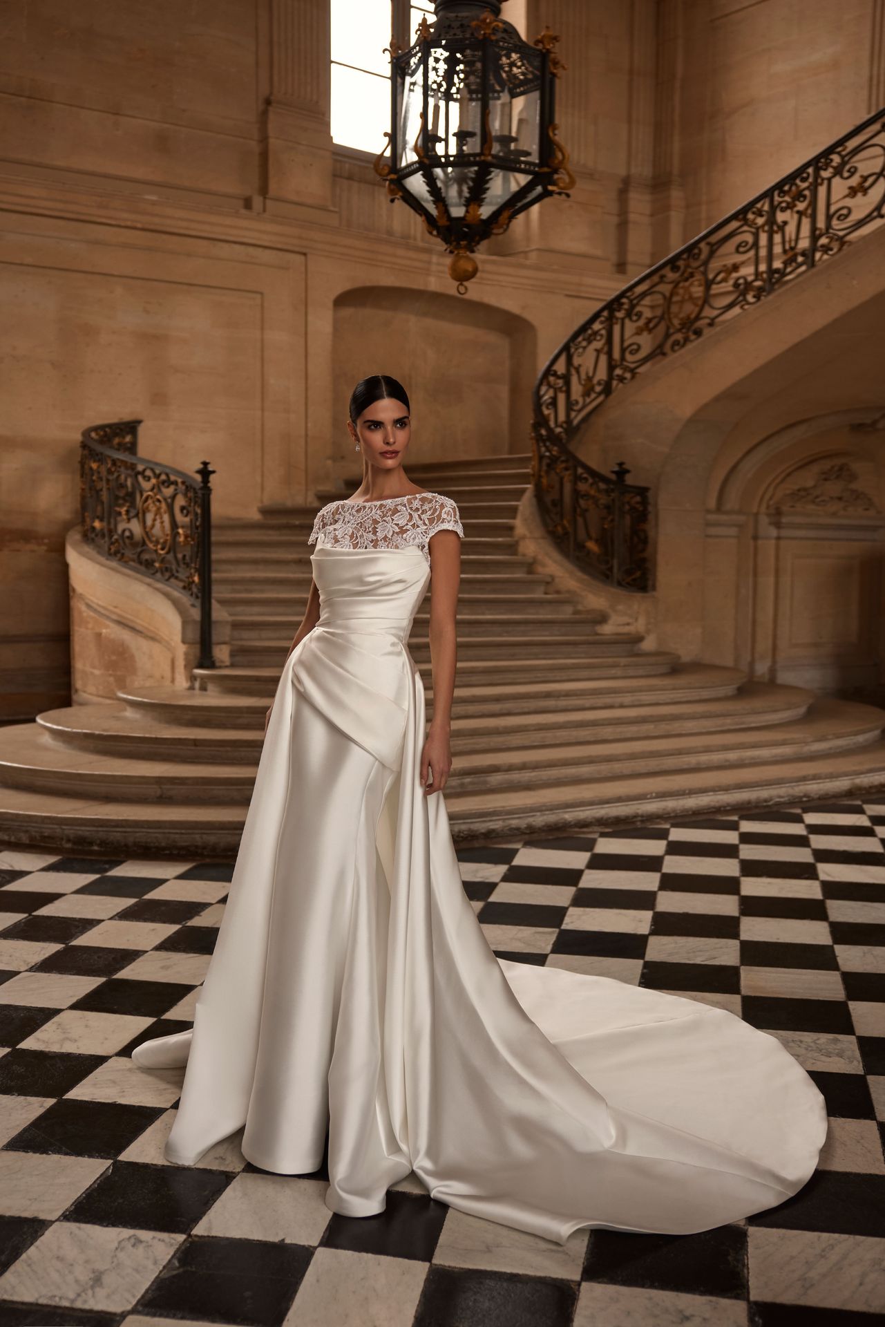 Wyjątkowa suknia wierzchnia uszyta z luksusowej satyny i ręcznie drapowana. Z drapowanym gorsetem i asymetryczną mini spódniczką z długim trenem. W połączeniu z koronkową lub cekinową suknią, gra tekstur tworzy efektowny ślubny look.
