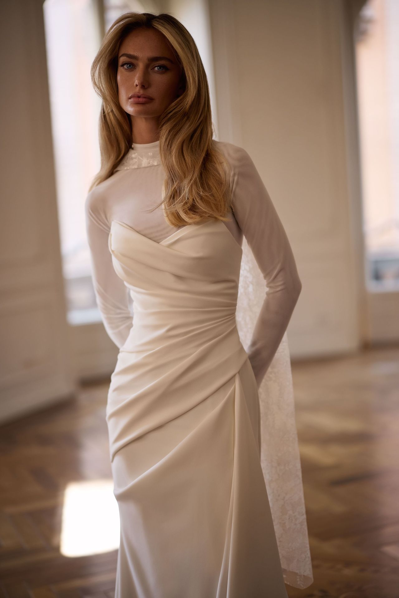 Przezroczyste bolerko z golfem wykonane z delikatnego tiulu. Posiada długie dopasowane rękawy i elegancki wysoki dekolt z delikatnym koronkowym szalem spływającym po plecach.