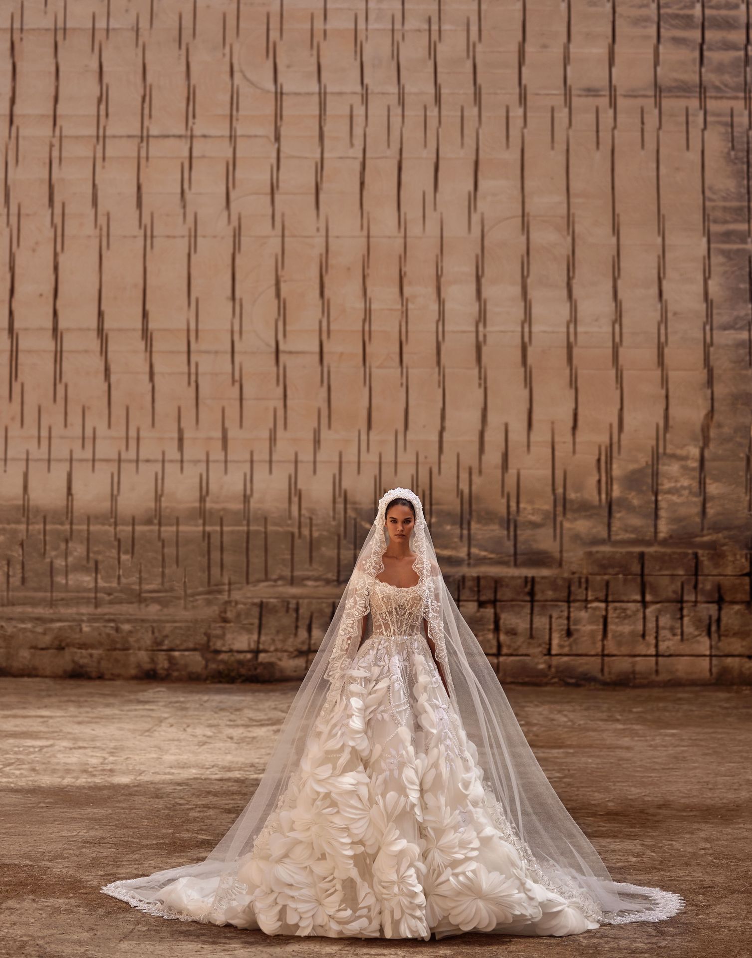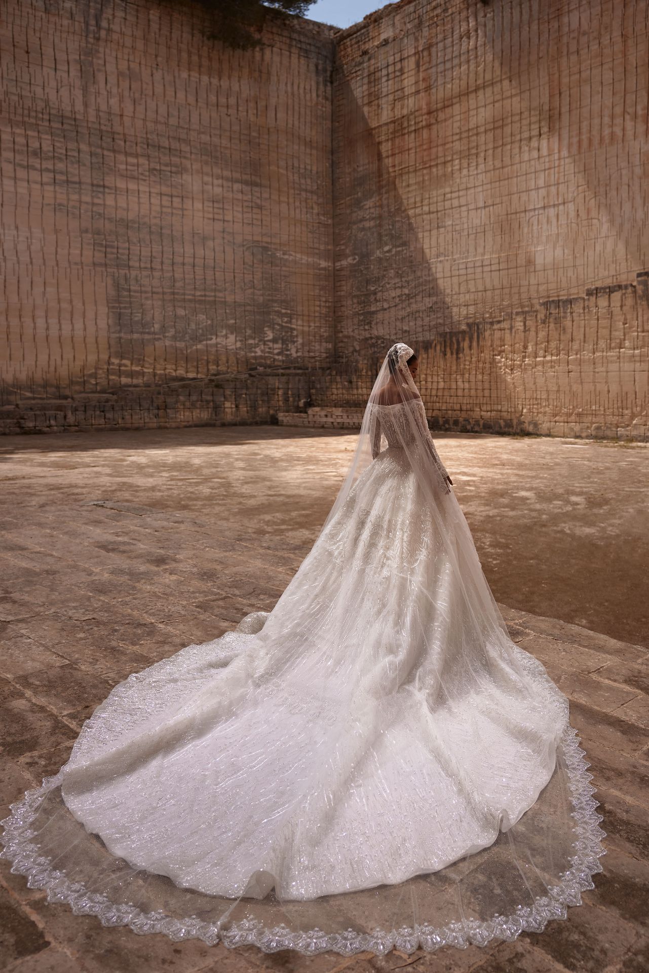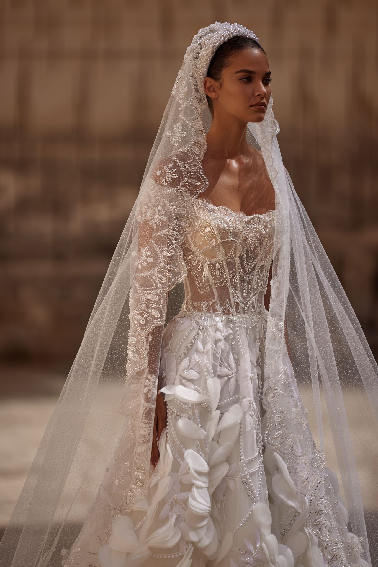 Wspaniały błyszczący tiulowy welon Juliet cap ozdobiony ręcznie wykonanymi koronkowymi zdobieniami delikatnie posypanymi wzdłuż jego krawędzi.