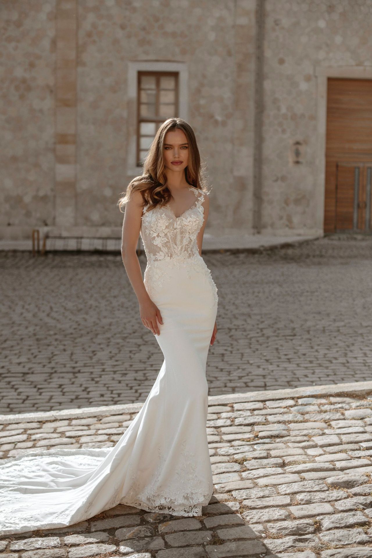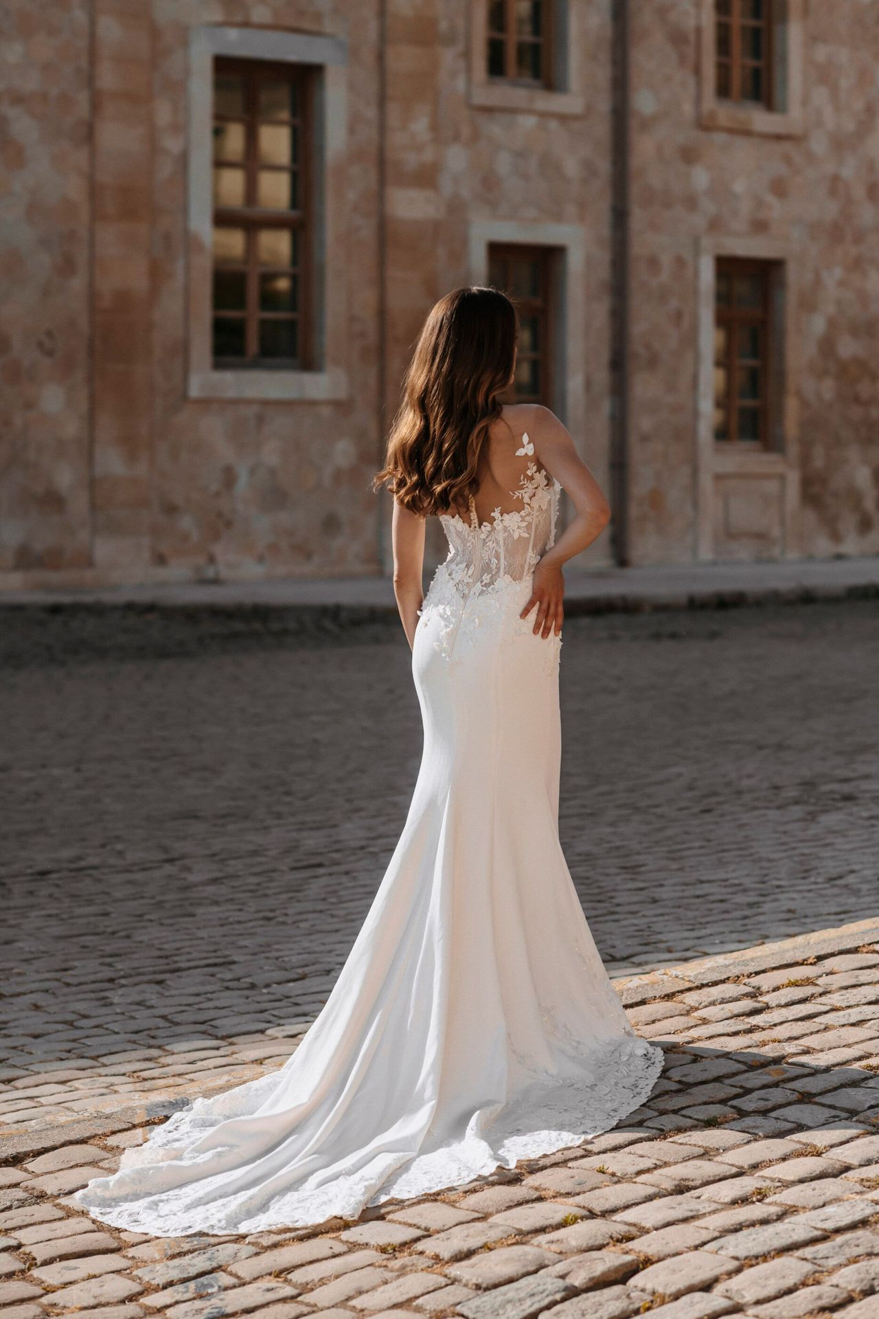 Delikatna suknia ślubna w białym kolorze z dekoltem w kształcie serca i półprzezroczystym gorsetem z koronkową aplikacją. Posiada odkryte plecy zapinane na guziki i długi katedralny tren.