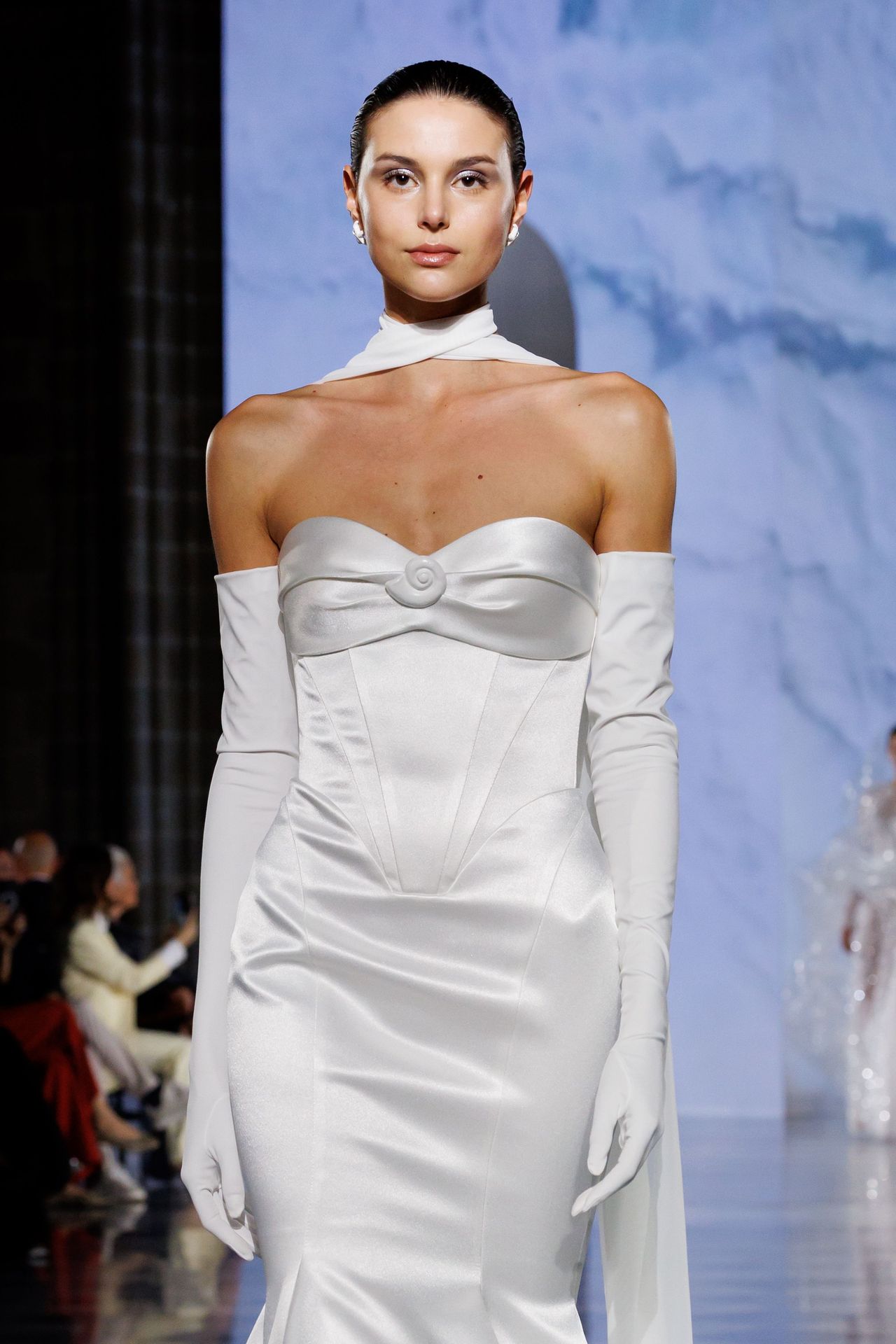 Efektowna suknia z połyskującej satyny. Posiada dekolt w kształcie serca z delikatnym drapowaniem, elegancko ozdobiony odpinaną broszką w kształcie muszli. Obniżony, wyprofilowany gorset z zamkiem błyskawicznym z tyłu i widocznym wiązaniem tworzy wyrafinowaną, wizualnie wydłużoną, dopasowaną sylwetkę. Godetowa spódnica z gracją modeluje sylwetkę, odsłaniając jej prawdziwe centrum - dramatyczny rozkloszowany dół wykonany z obszernej plisowanej organzy ułożonej w zwiewne, rzeźbiarskie fale.