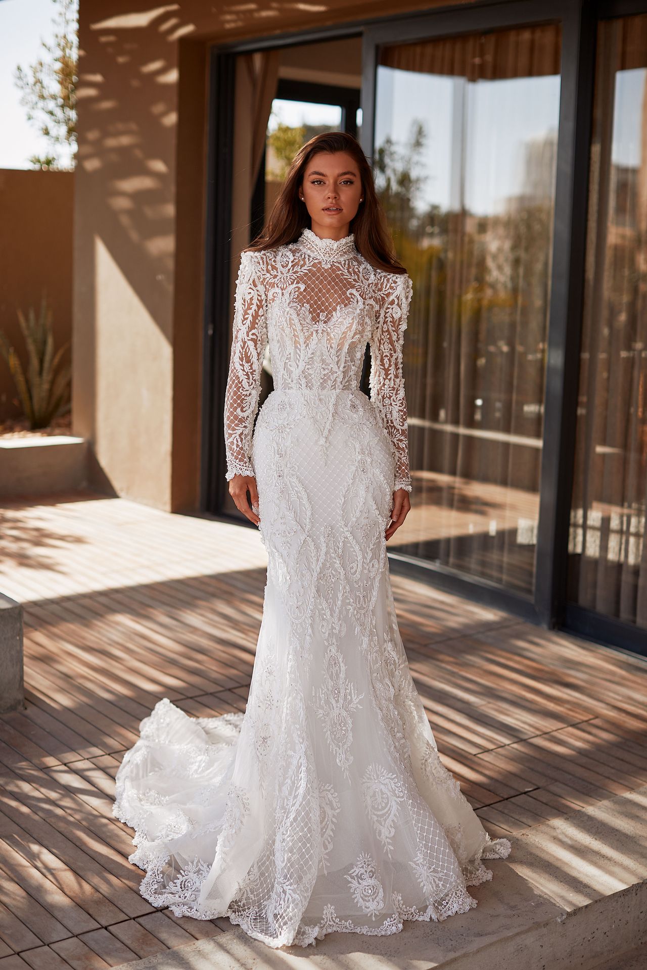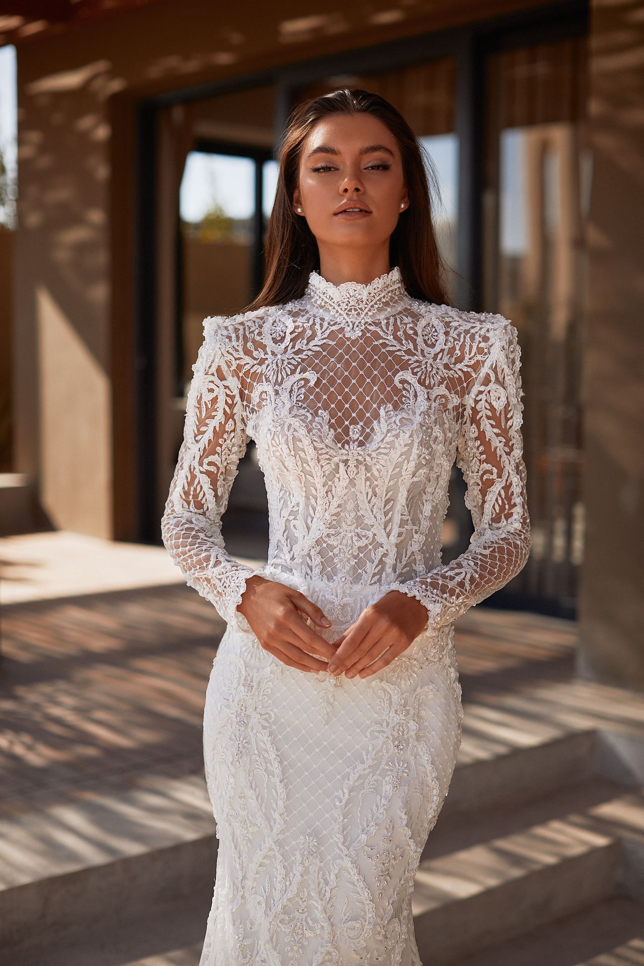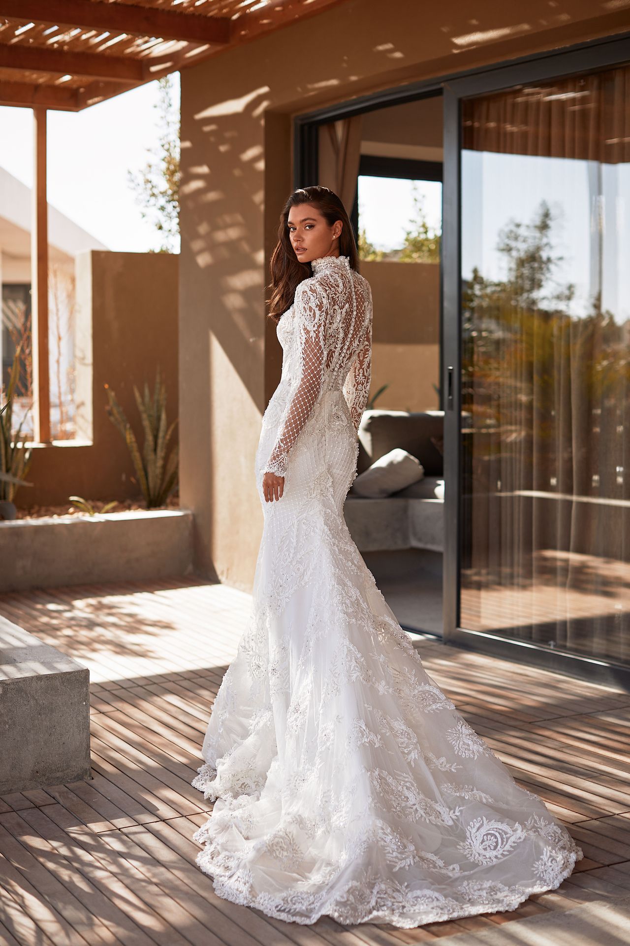 Delikatna suknia ślubna o kroju syrenki z koronkowymi aplikacjami w kolorze kości słoniowej. Ma długi rękaw, półprzezroczyste plecy zapinane na guziki i długi tiulowy tren z koronkowymi aplikacjami.