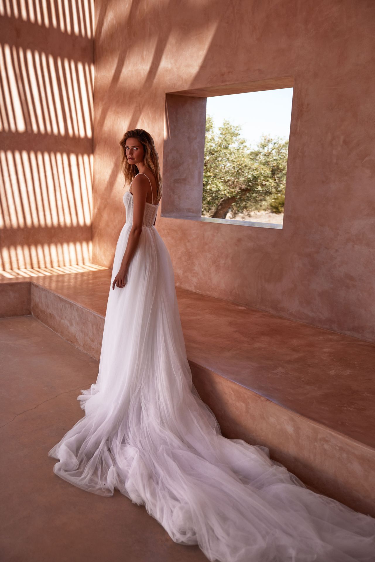 Księżniczkowa, zwiewna tiulowa suknia ślubna o linii A na ramiączkach typu spaghetti.