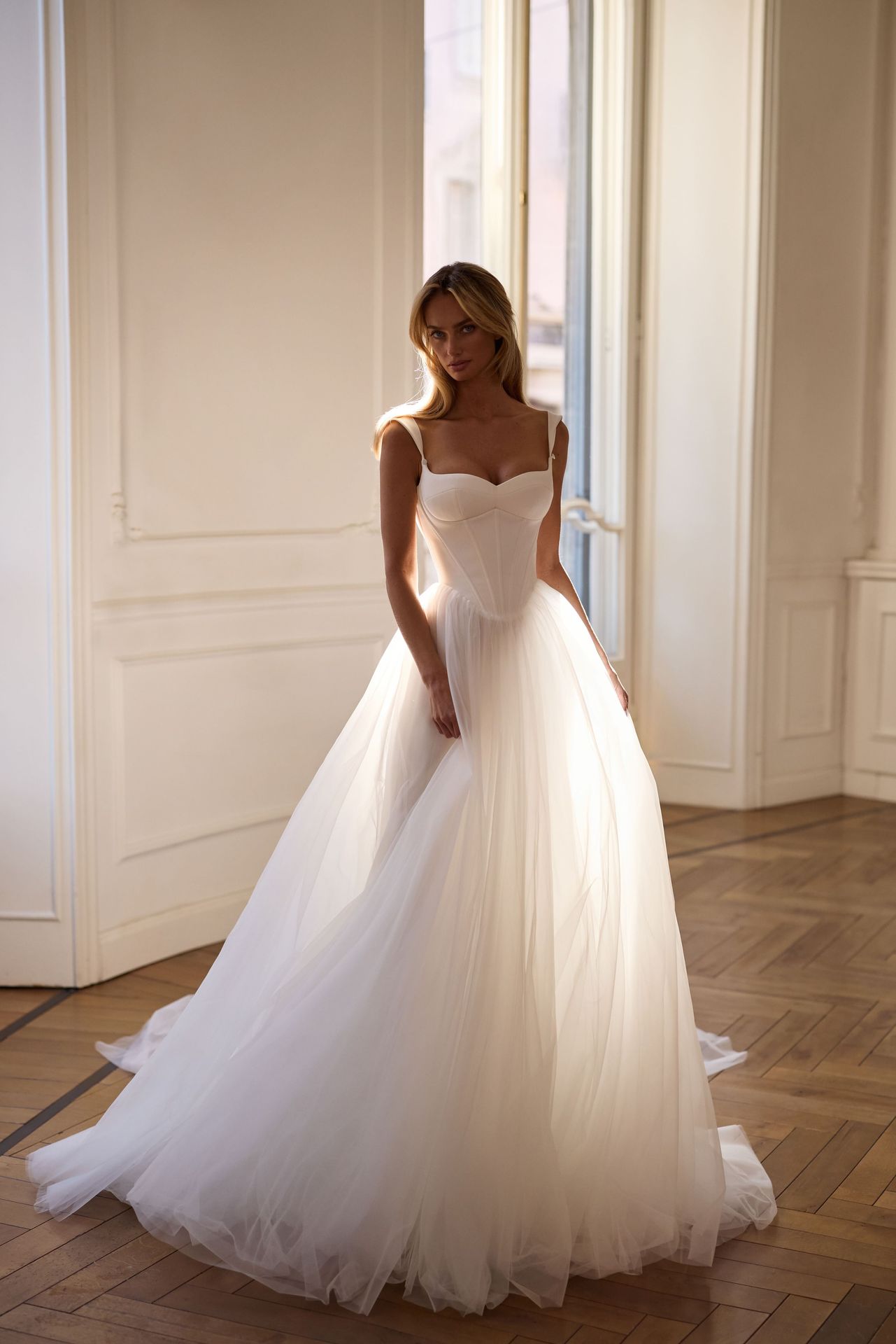Marzycielska suknia ślubna o linii A ze strukturalnym satynowym gorsetem i delikatną tiulową spódnicą. Posiada dekolt w kształcie serca z szeroko rozstawionymi ramiączkami, podkreślającymi dekolt i dodającymi wsparcia, gorset z wbudowanymi miseczkami, koronkowe zapięcie i zwiewną tiulową spódnicę. Wygląd można wzbogacić inspirowanym stylem vintage chokerem Lia, aby uzyskać idealne wykończenie.