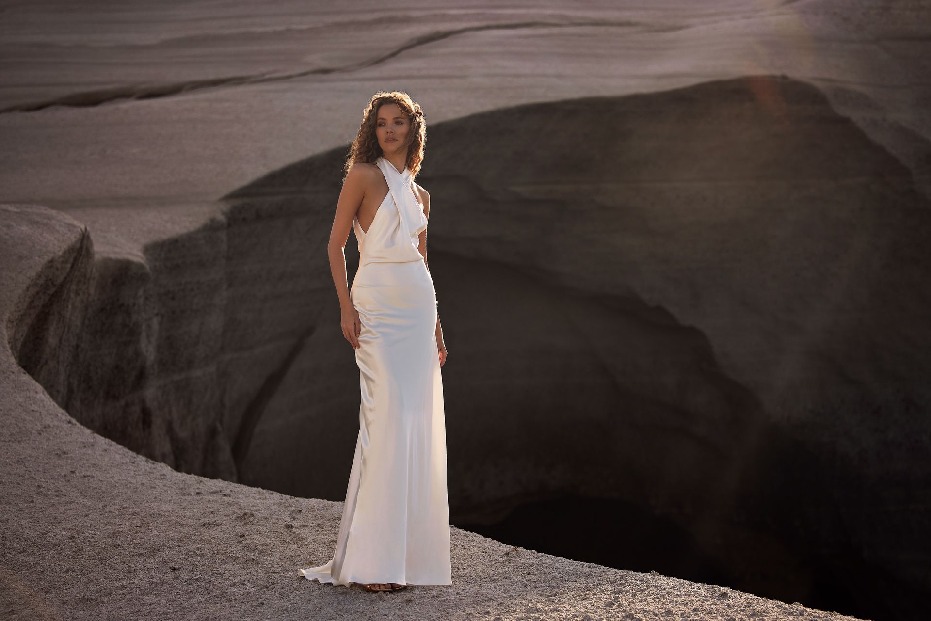 Minimalistyczna dopasowana suknia ślubna bez ramiączek z satyny z paskiem na szyi, drapowanym gorsetem i głęboko odkrytymi plecami.